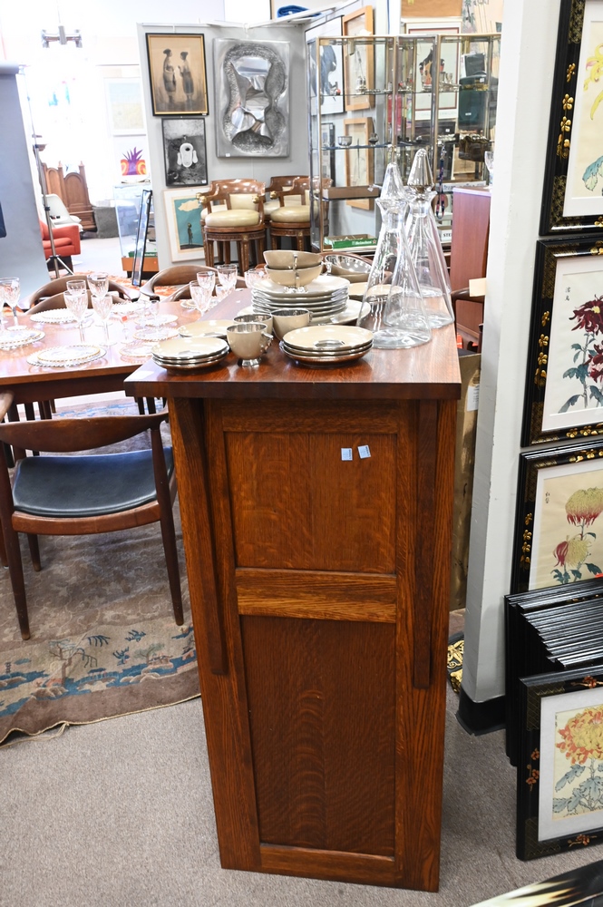 Mission Oak Style Bookcase, with one door, height 44 inches, top 19.5″ x 28.5″.