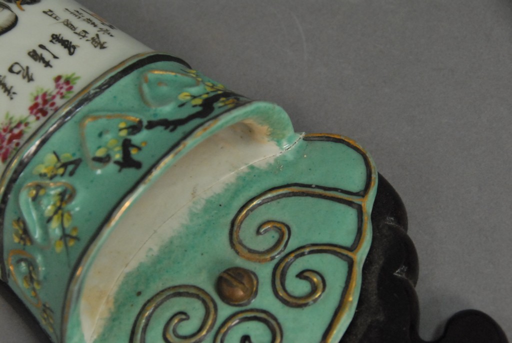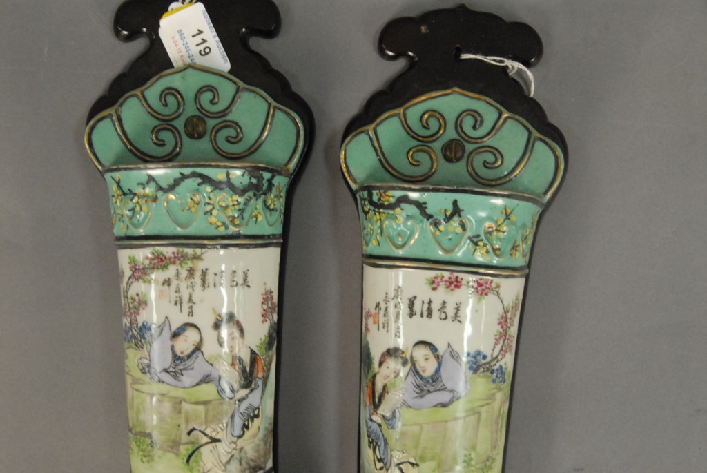 Lot 119: Pair of Famille Verte porcelain wall pockets with painted scene of two girls reading one as is, ht. 12.