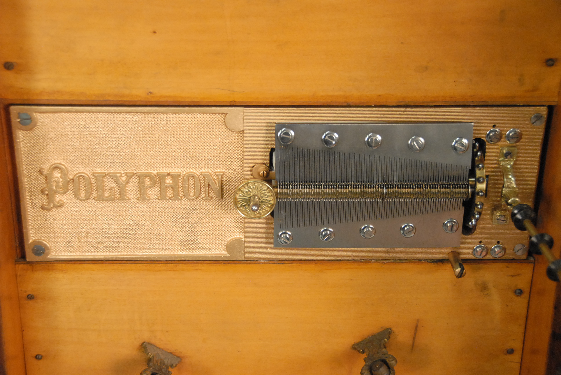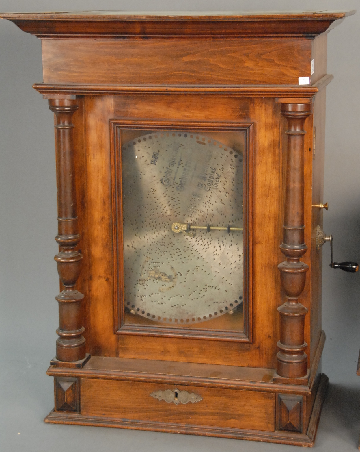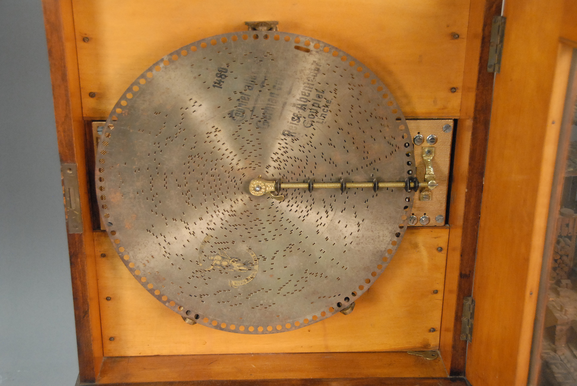 Polyphon upright disc music box with thirty-six 16 discs. cabinet: ht. 32in. wd. 25in. dp. 15in. discs: dia. 15 1/2in.