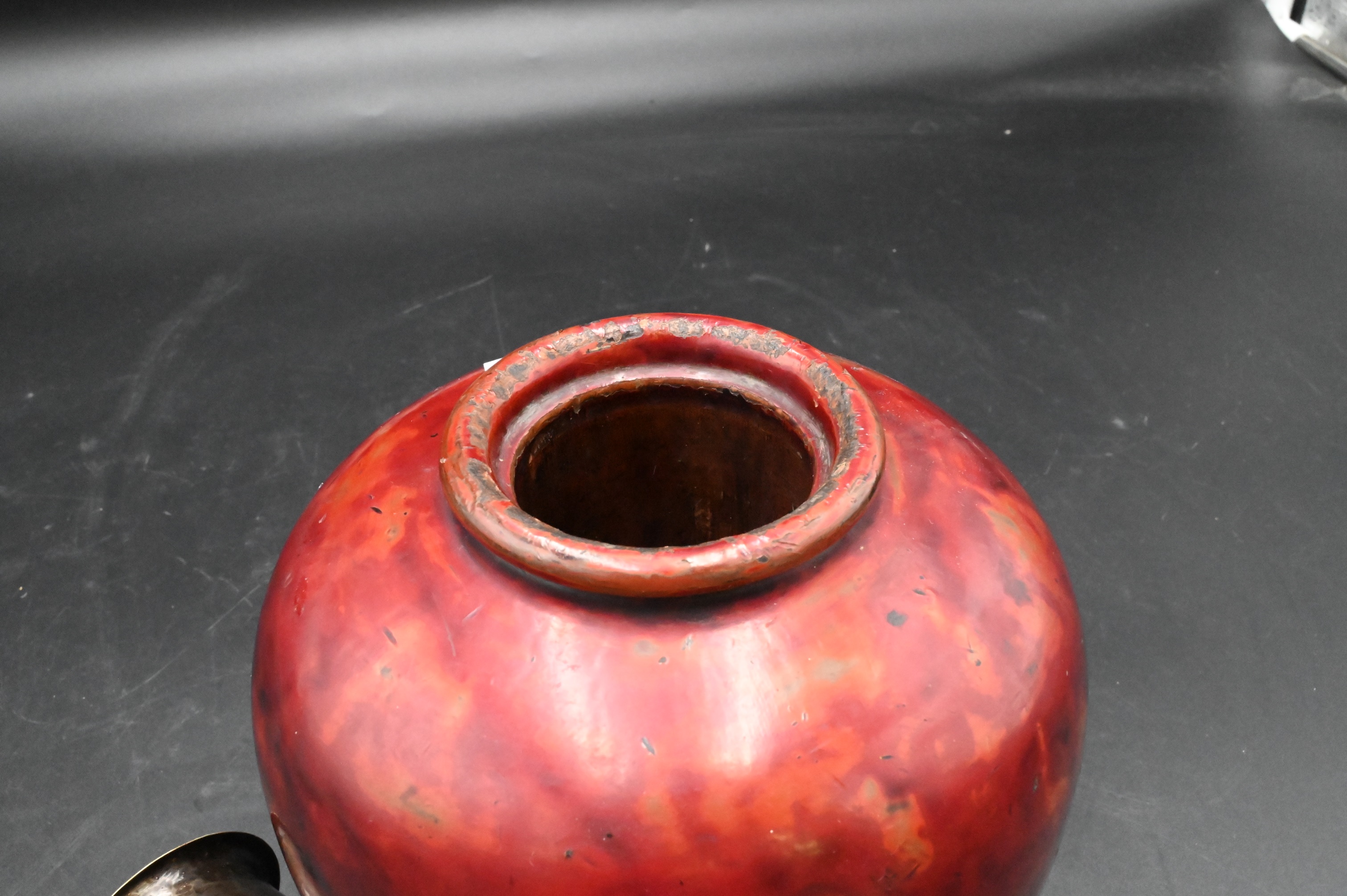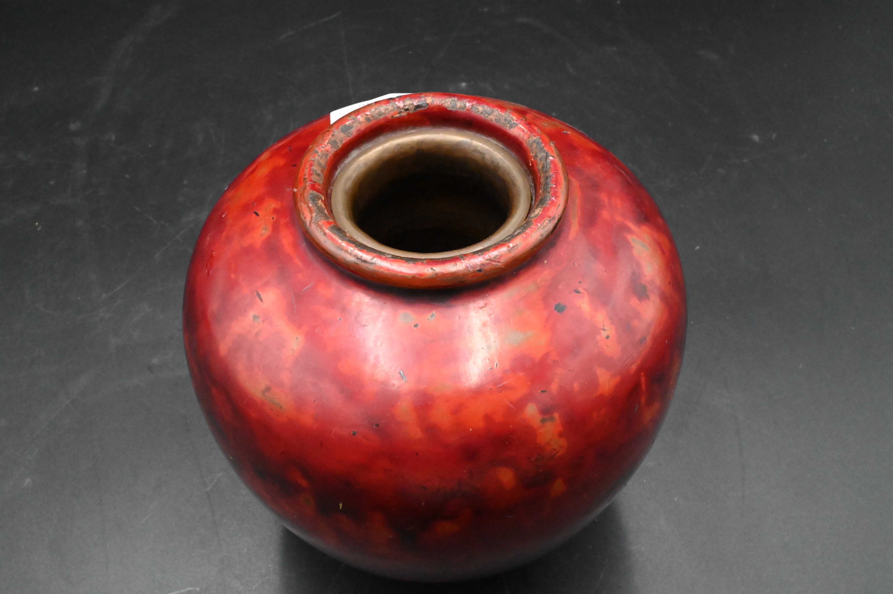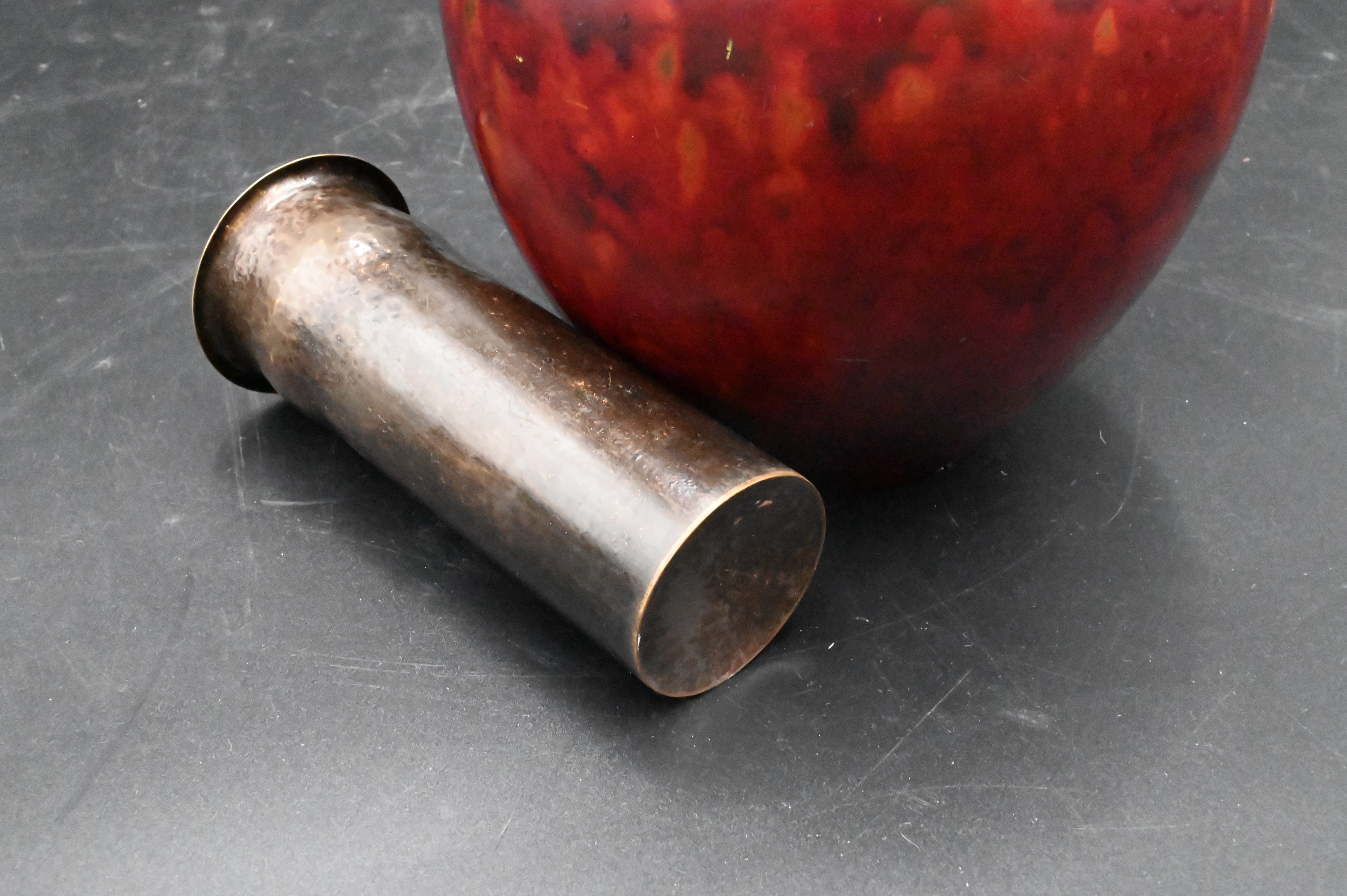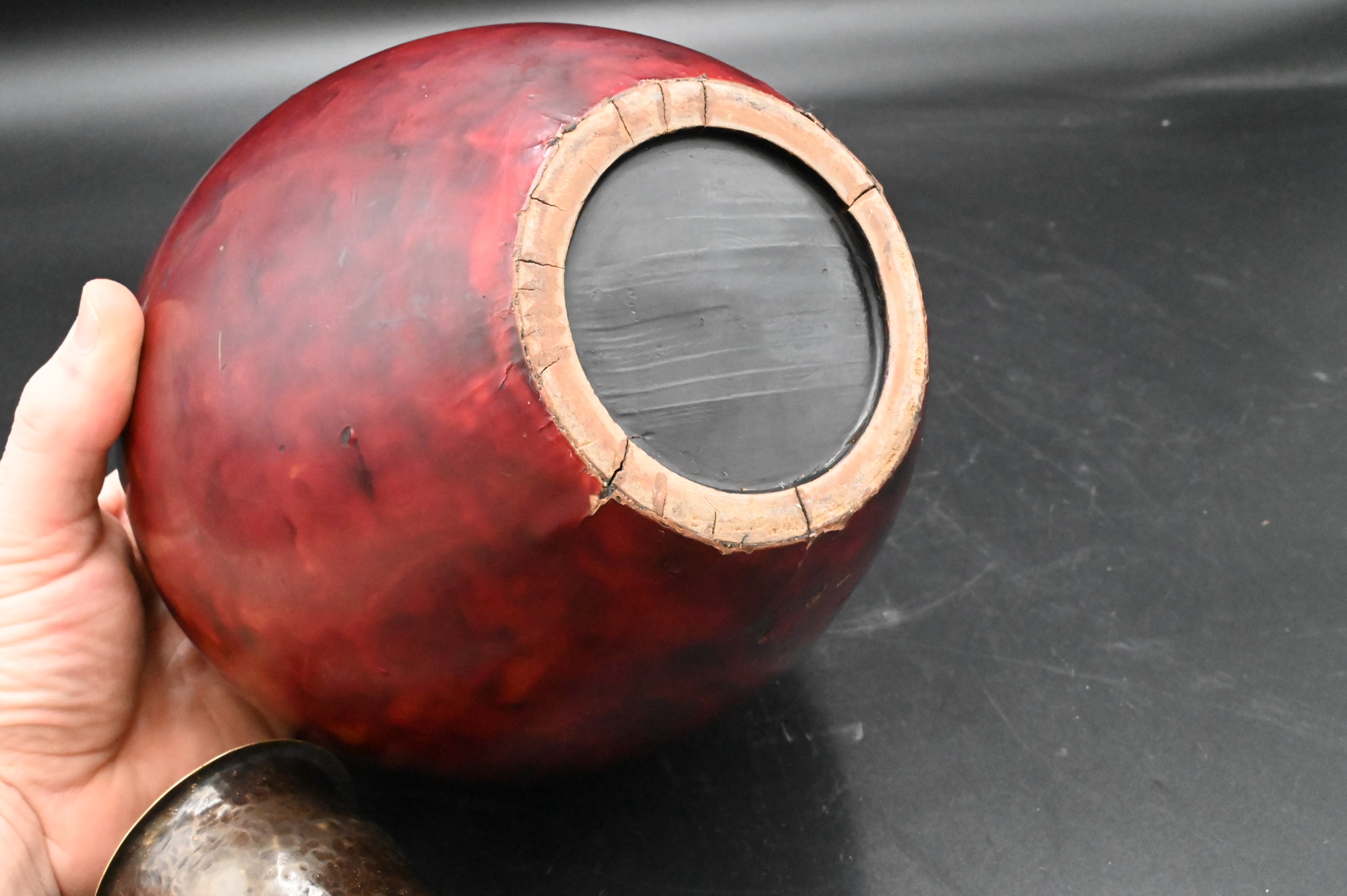 Red Lacquer Carved Bamboo Vase, Bulbours form brass insert, height 7 inches, diameter 8 inches