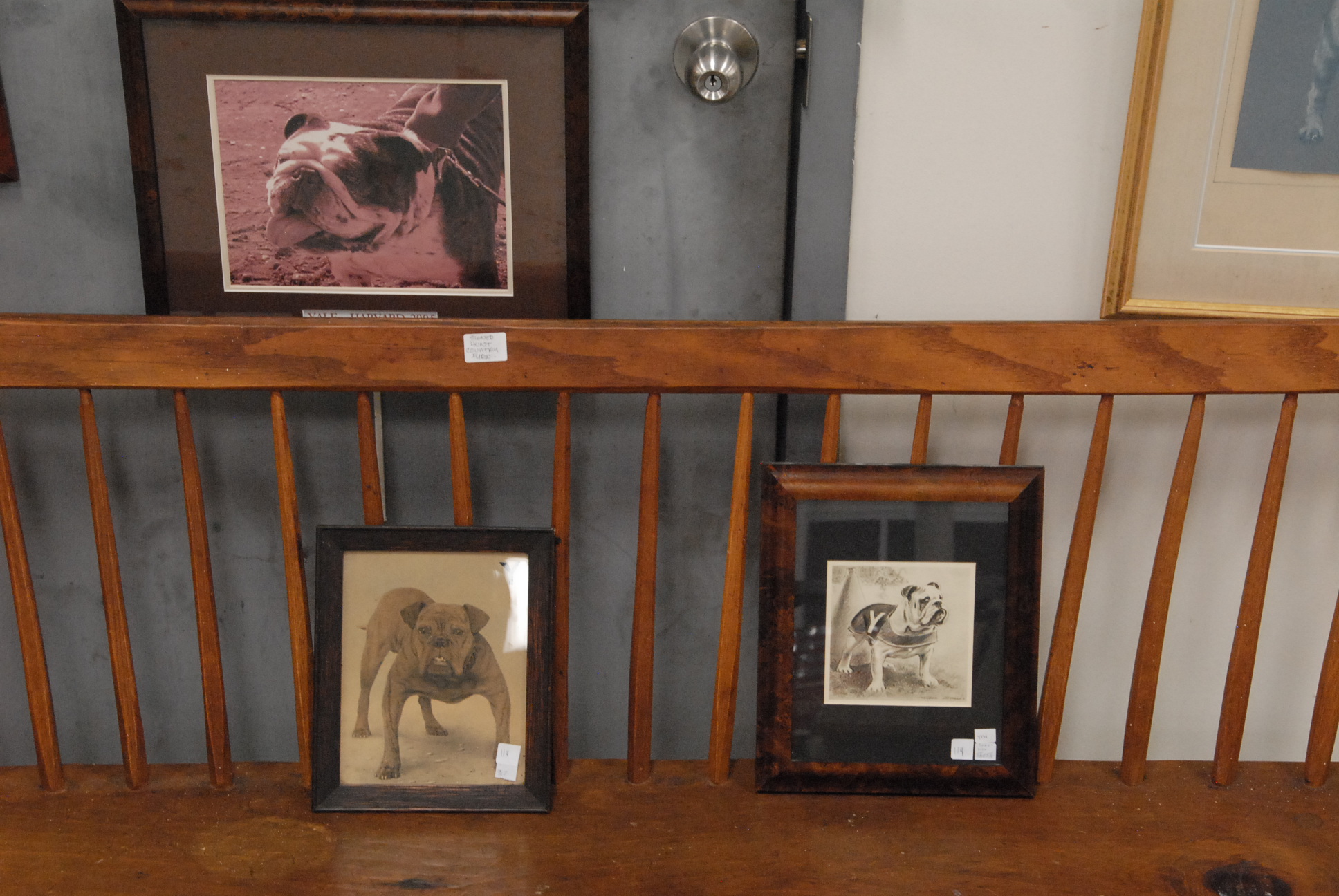 Six piece framed lot Yale University seal signed Colonna from ‘Yale A Portrait’ 2000, English Bulldog ‘Handsome Dan’ signed E H Hart in plate circa 1940, Handsome Dan lithograph with Y circa 1890-1900 in original oak frame, Yale Bulldog lithograph signed Dennis in plate circa 1940, Handsome Dan Hold ‘Em Yale A B Graves 1890 reproduction, and Handsome Dan Well Rowed Yale A B Graves1890 reproduction, 17 1/2 x 13 1/2, 15 x 10, 15 x 10, 8 x 10, 9 x 7 & 5 1/4 x 5 1/4.