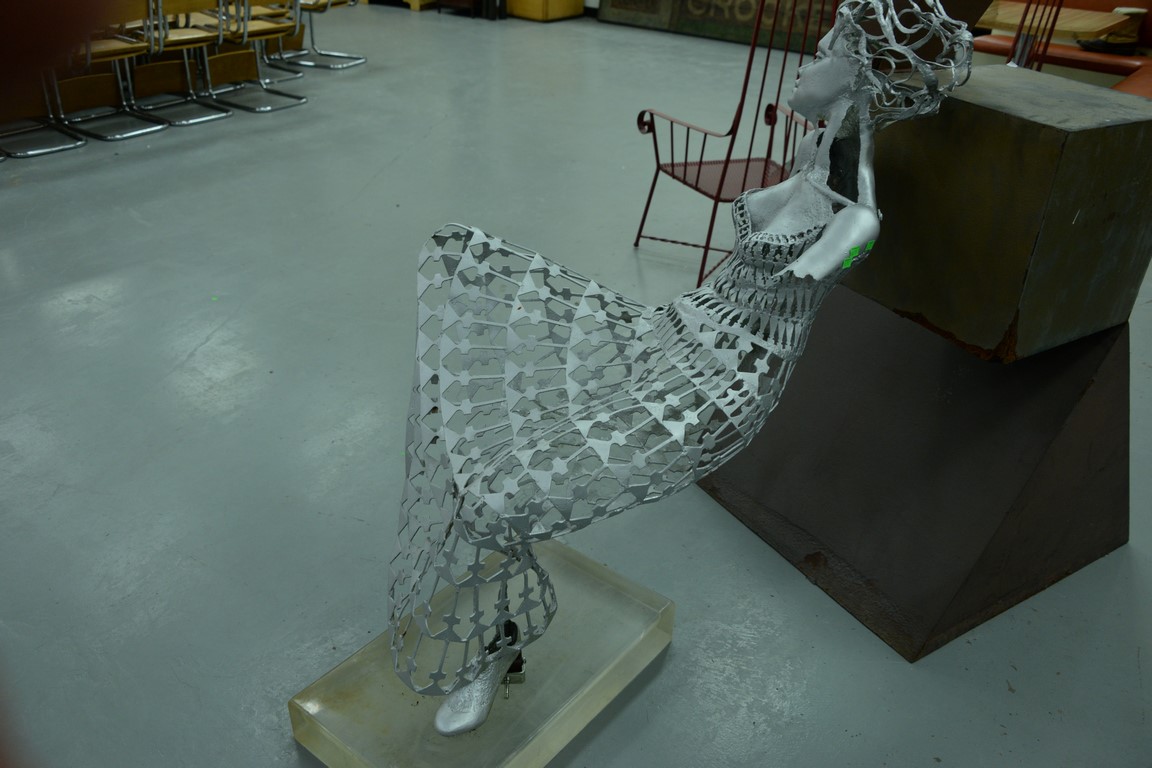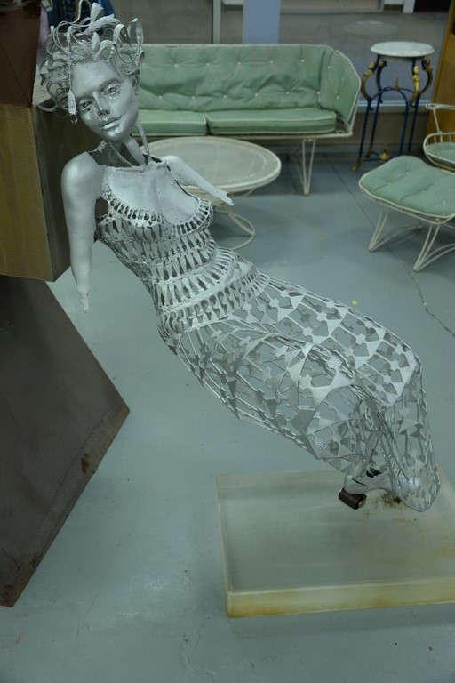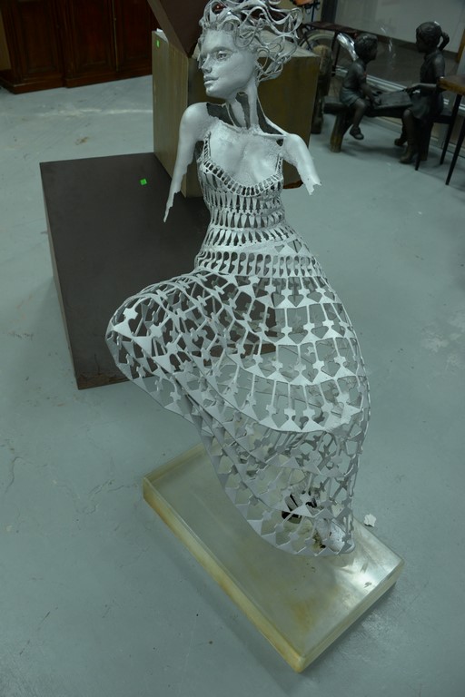 Lot 119: Steel sculpture of reclining woman with openwork dress set on Lexan base, attributed to Roz Newman. height 48 inches, length 50 i…