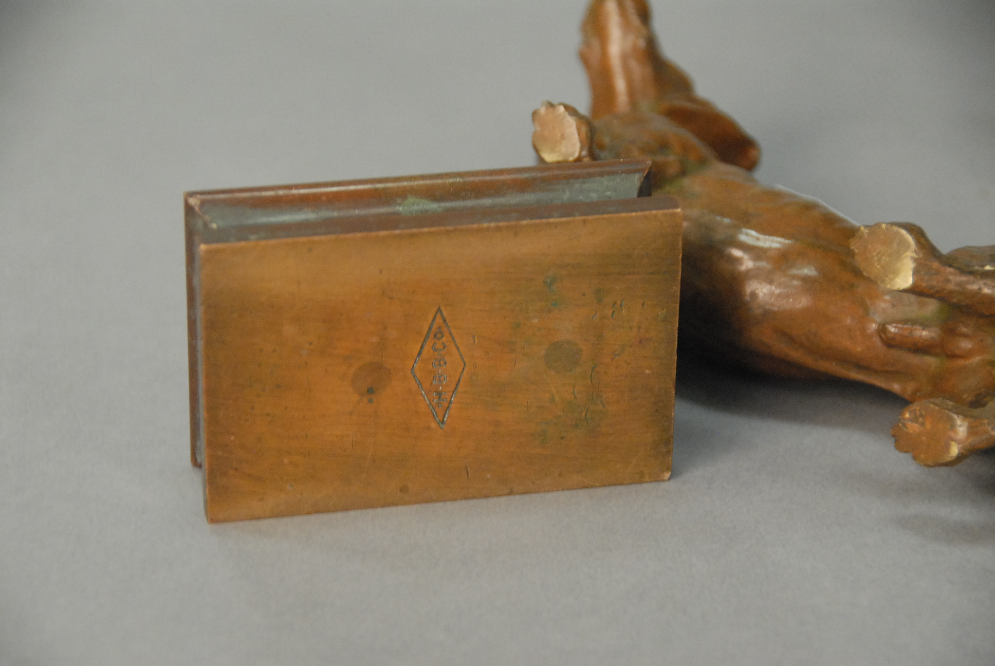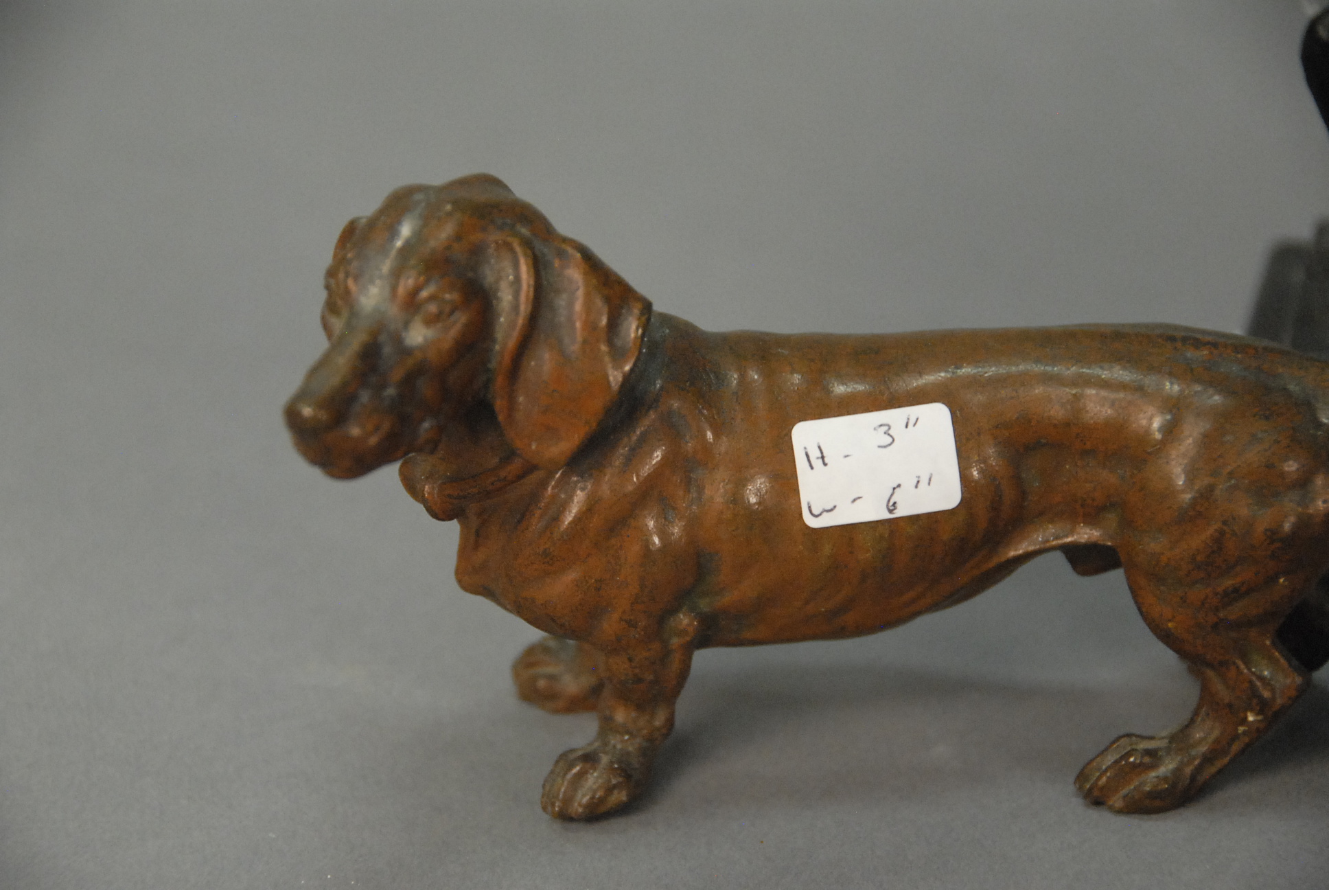 Lot 119: Three piece lot to include a bronze dog, bronze paperweight, and an iron horse with rider ht. 6 1/2in.