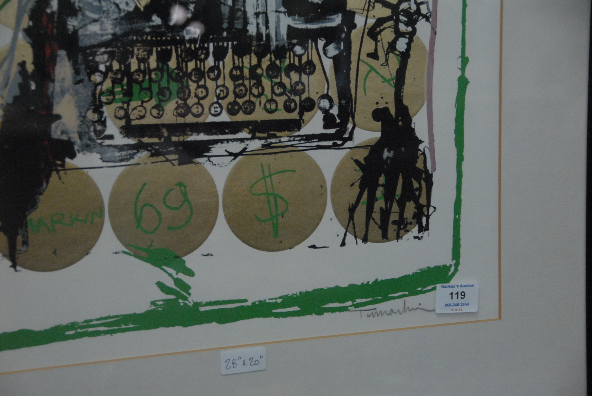 Lot 119: Ygael Tumarkin b. 1933 Astronaut K silk screen signed lower right Tumarkin numbered lower left 71/100 with art exhibition label …
