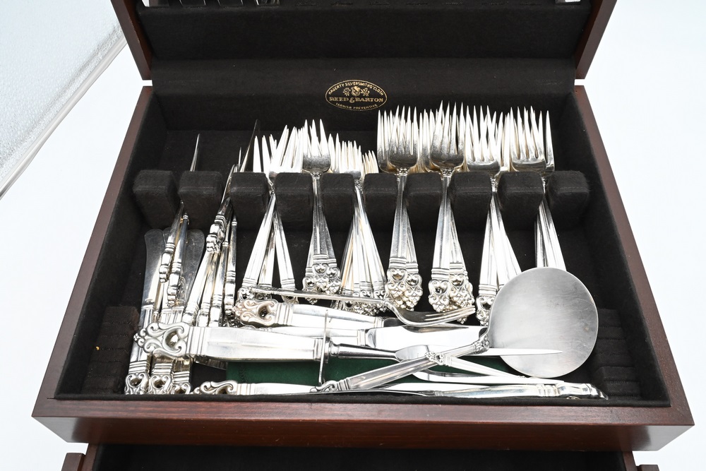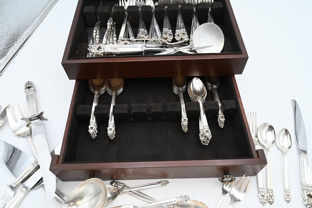 to include 12 dinner knives, 12 dinner forks, 12 lunch forks, 12 butter knives, 12 hors d’oeuvres forks, 12 salad forks, 12 soup spoons, 24 teaspoons and 13 serving pieces