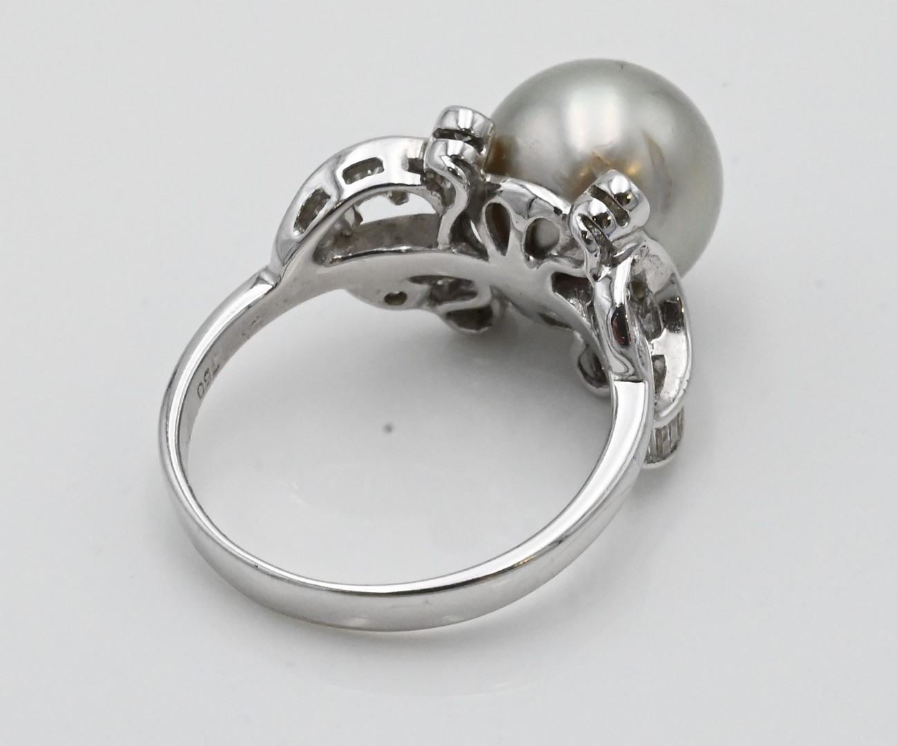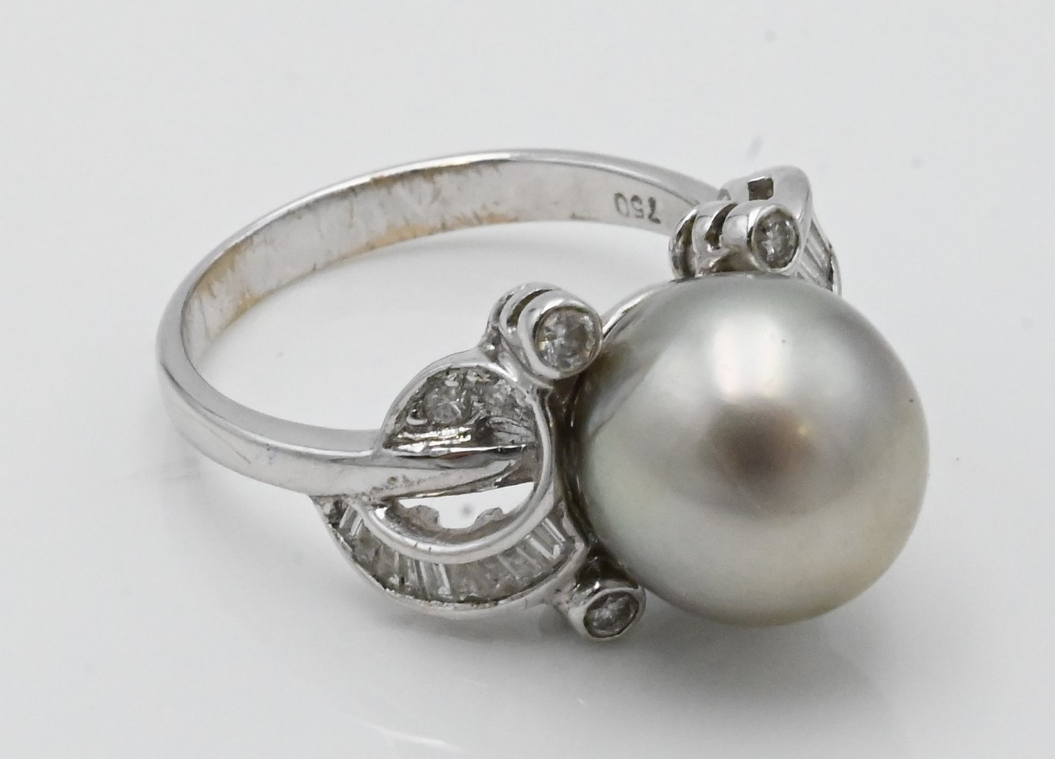 18 Karat White Gold Ring, set with center grey pearl, 10.2 millimeters, baguette and round diamonds, size 6 1/4, 5.5 grams.