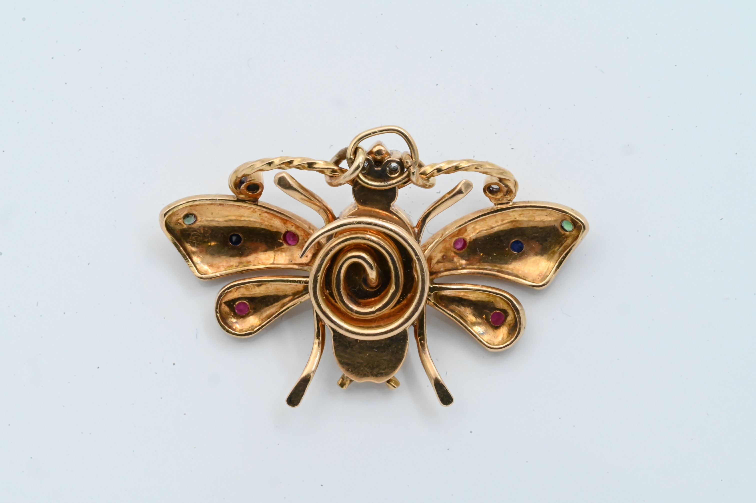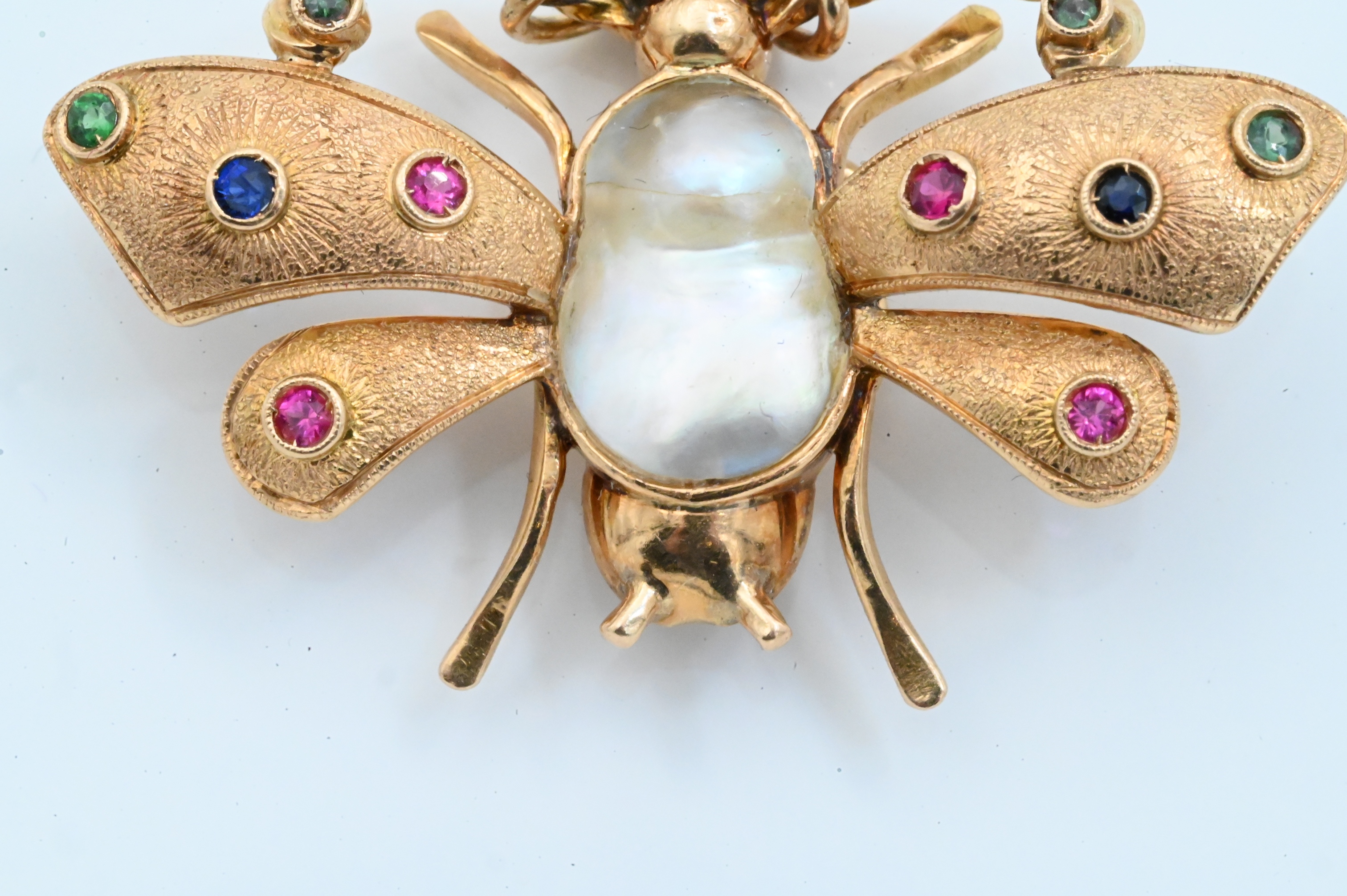 Centering a baroque pearl body with diamond-set eyes, wings accented with rubies, sapphires, and emeralds; fitted with pin and pendant loop for optional wear. Measures 1 inch x 2 inches. Total weight 7.2g.