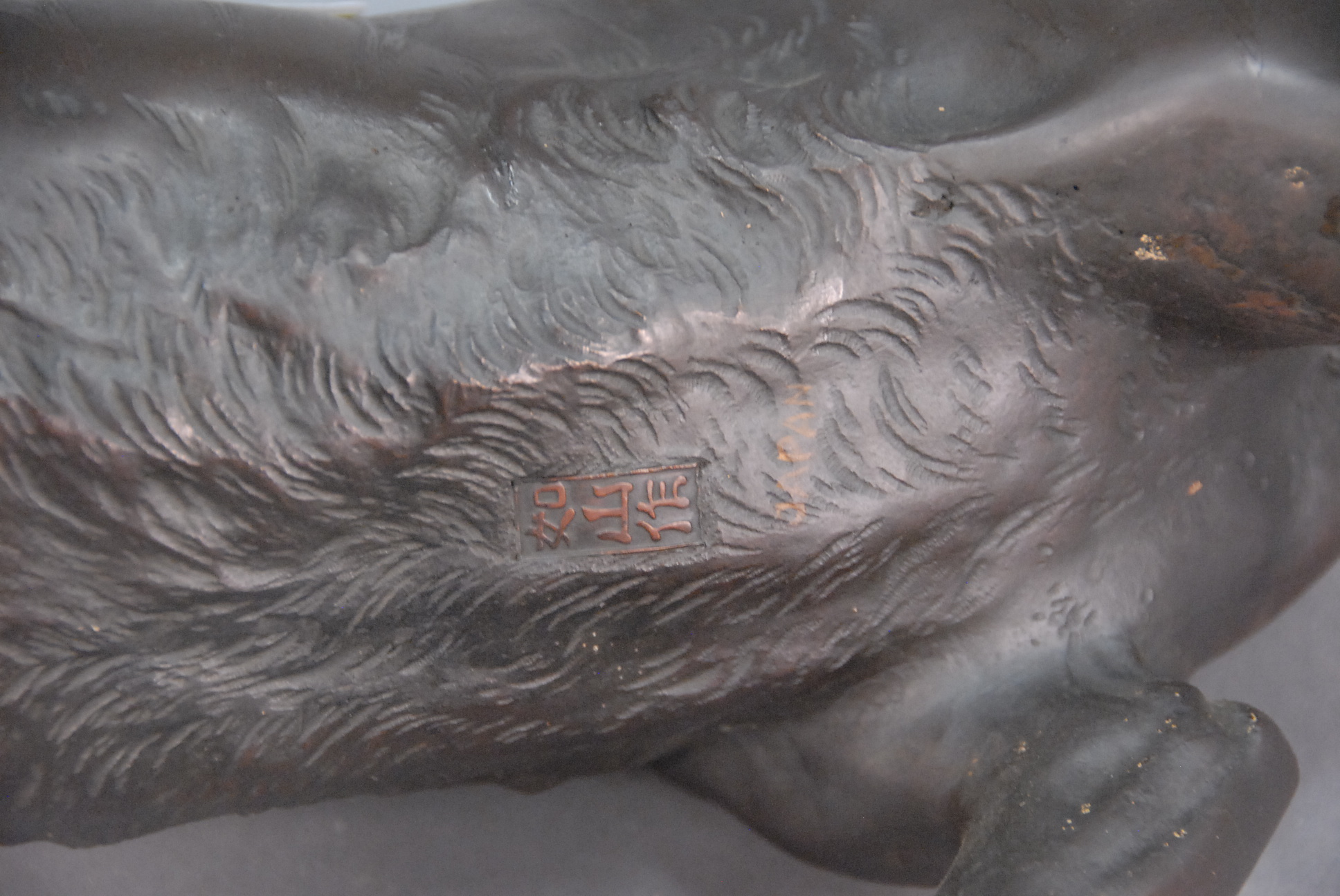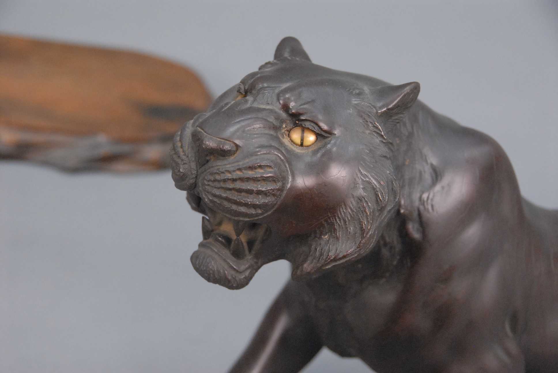 Bronze tiger on base, marked on bottom, lg. 25, ht. 12 1/2.