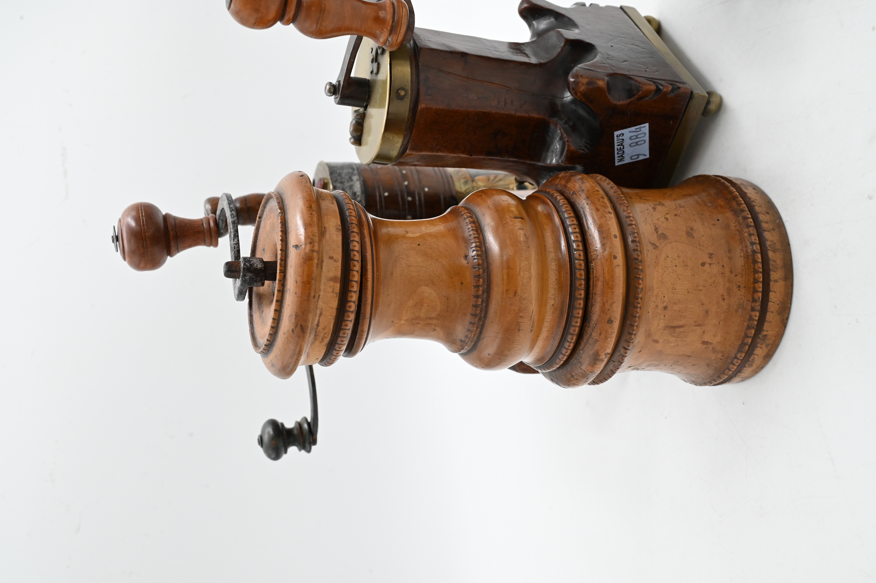 to include Indian or Turkish grinder having metal mounts and glass jewel insets, turned wood grinder, spice / tobacco grinder having wood and brass inlay with single pull drawer, along with two French grinders having long neck over square body and single drawers, one marked L.B.