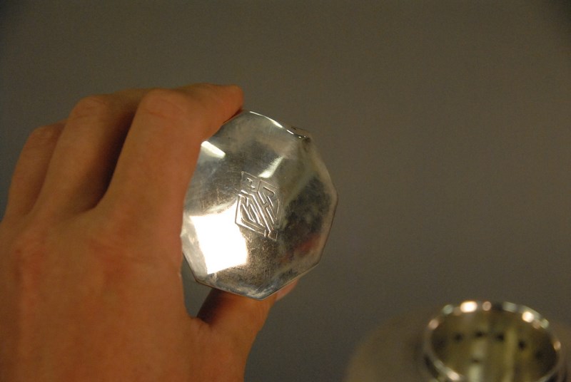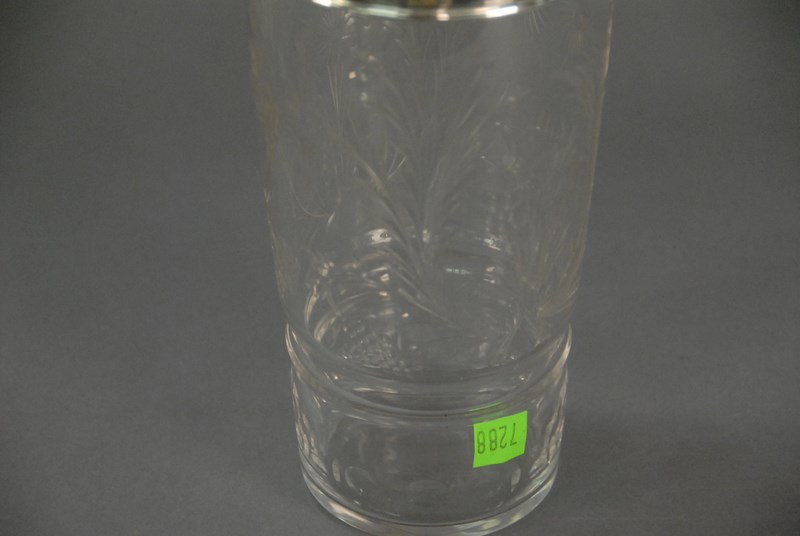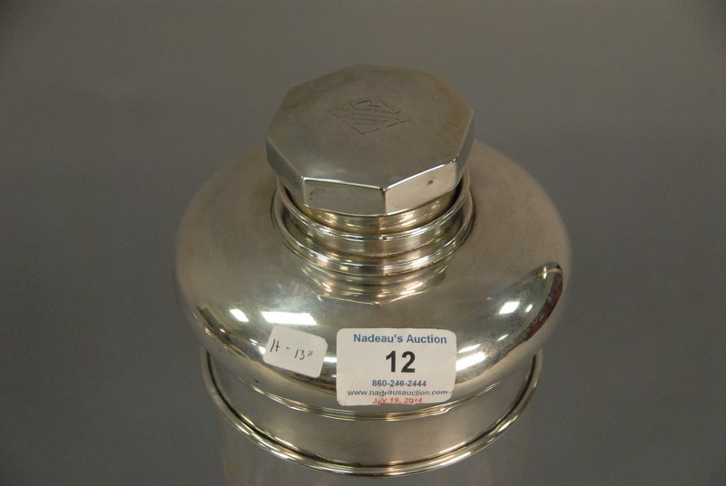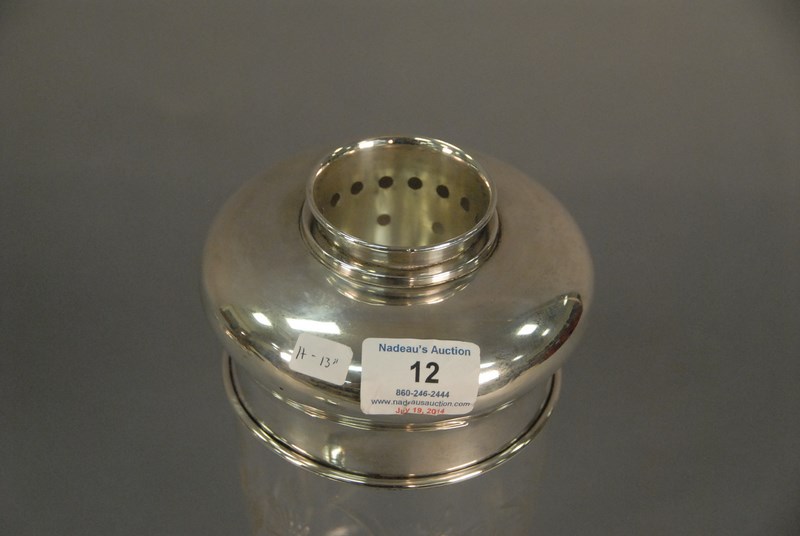 Crystal cocktail shaker with sterling silver two piece top, probably Hawks, ht. 13in.