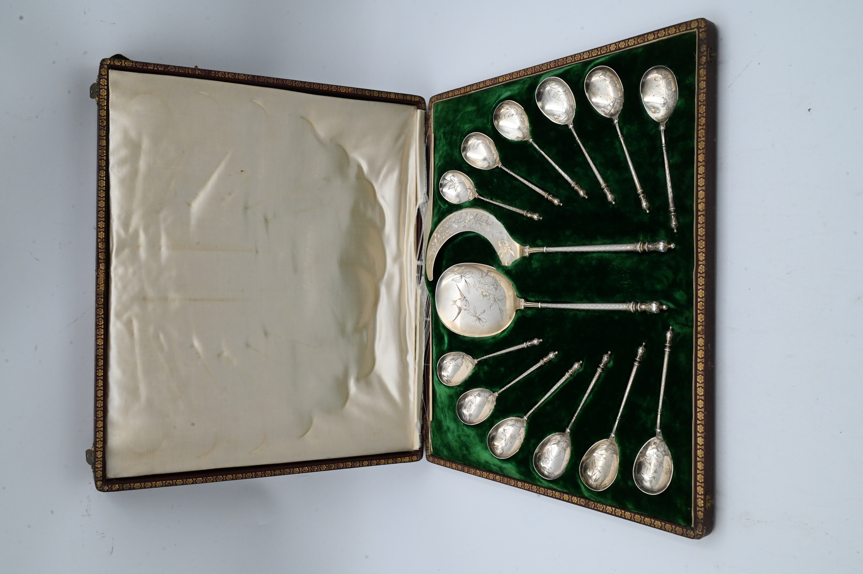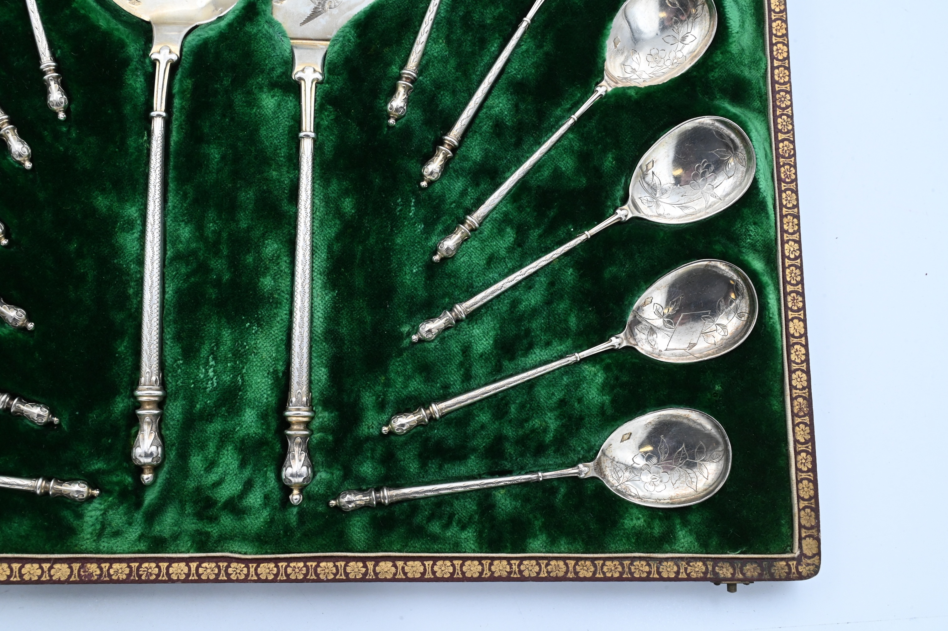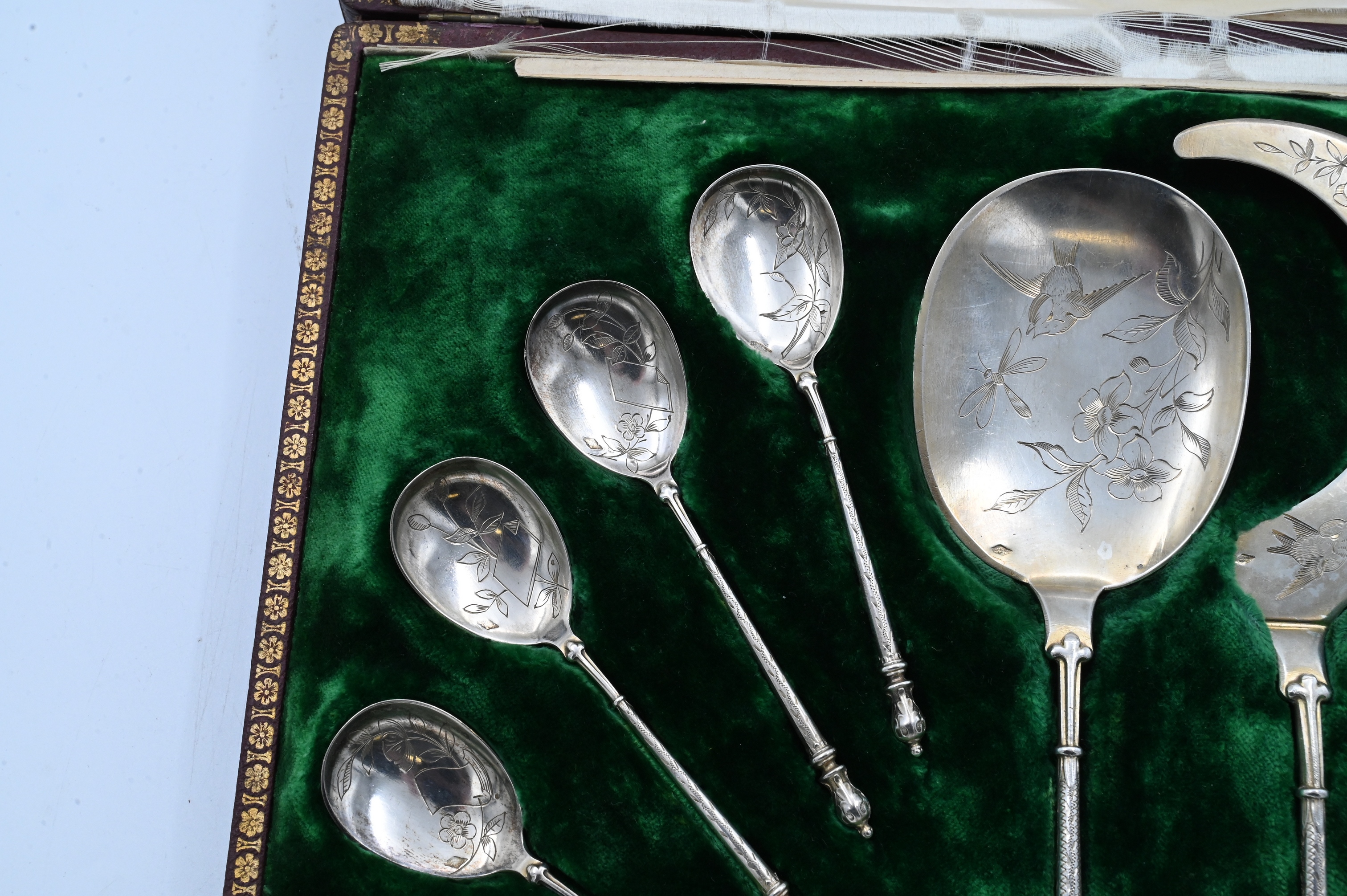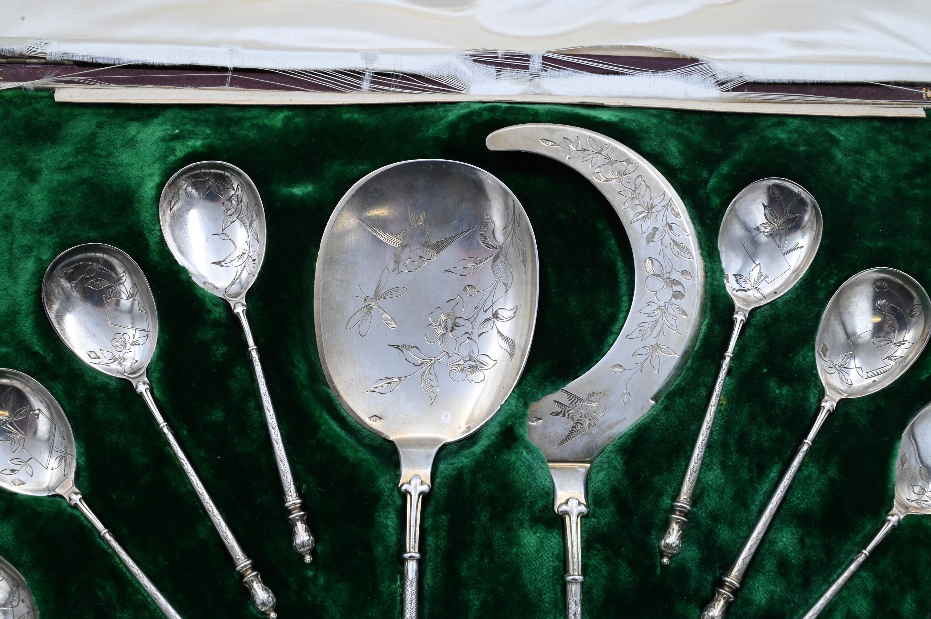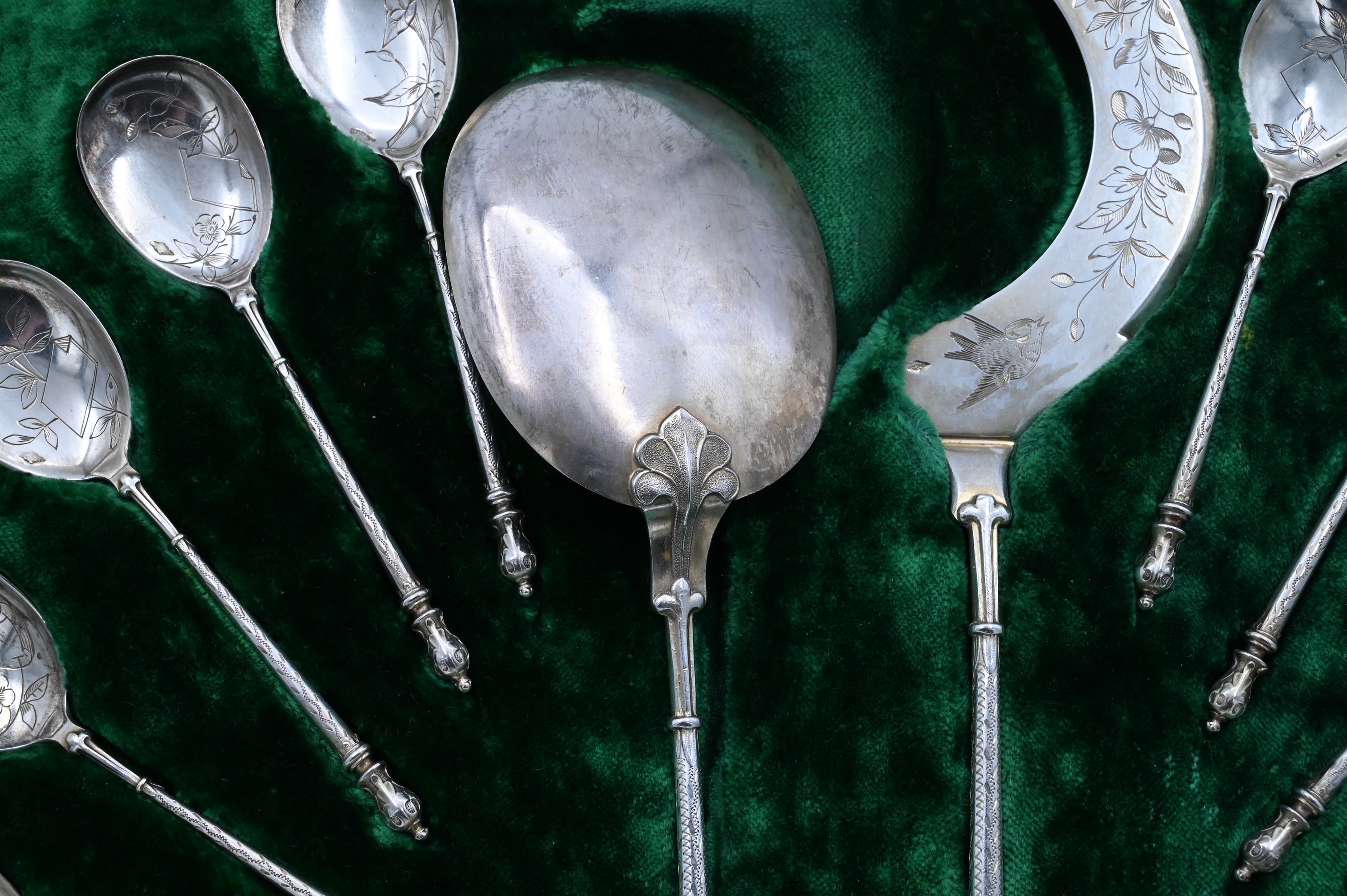 to include 12 spoons, one large server and ice cream sickle having engraved floral and bird motif in original box