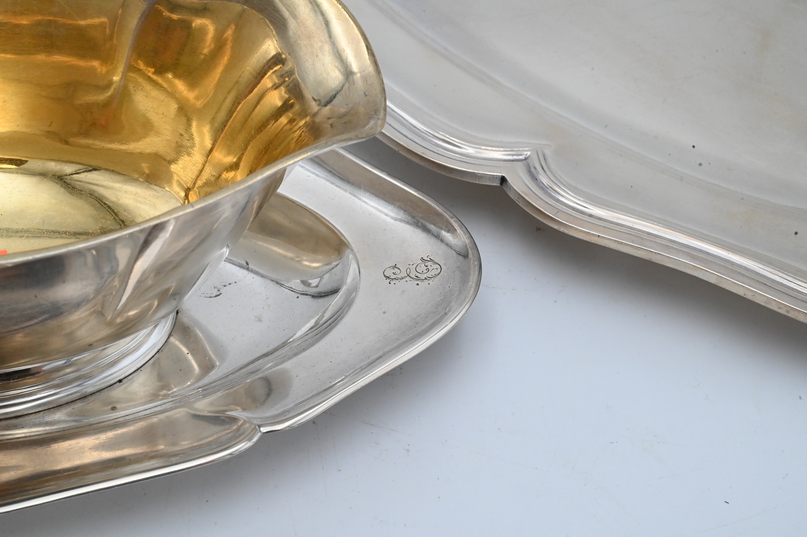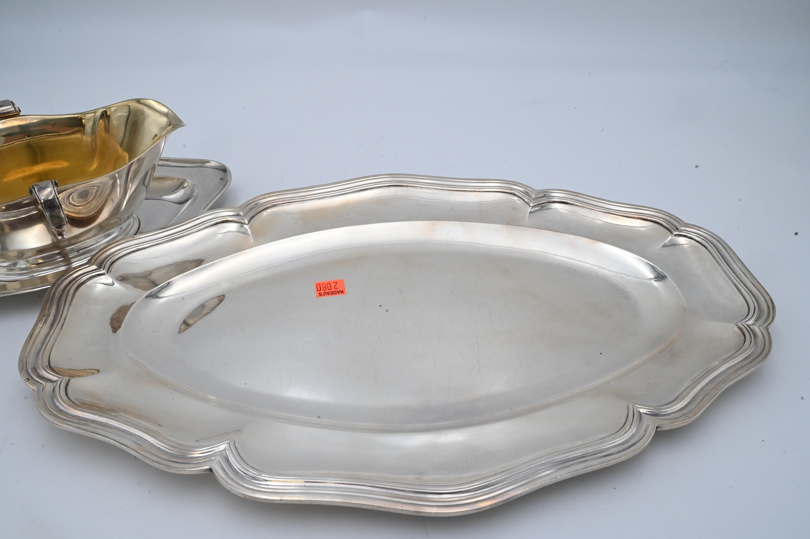 German Silver Two Piece Lot, to include a tray along with a gravy boat with underplate, D. Vollgold & Sohn, length 18 inches, 57 t.oz.