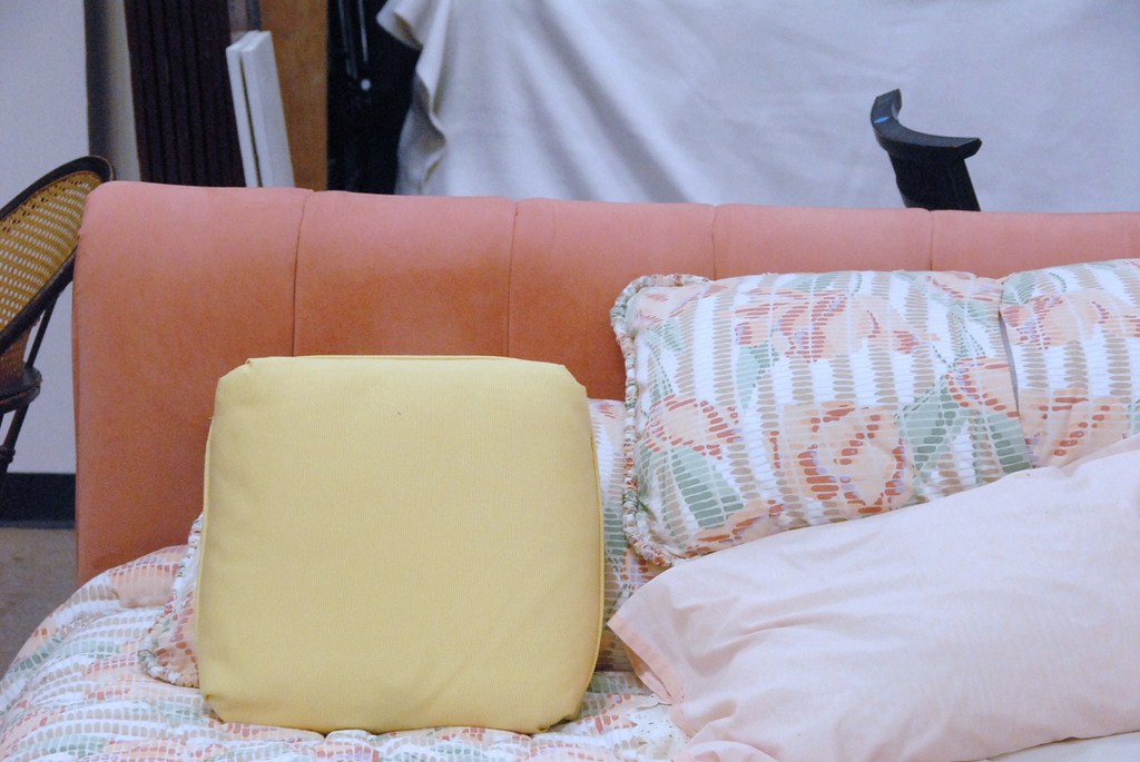 King size upholstered bed with upholstered headboard and frame, complete with quilted comforter and matching pillows.