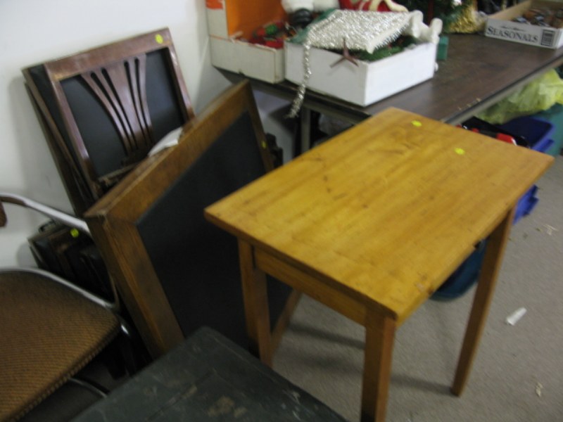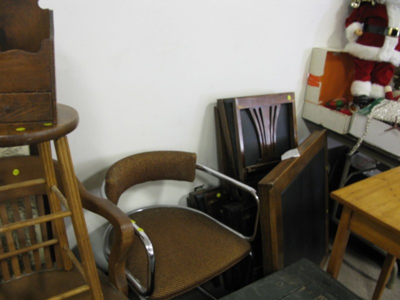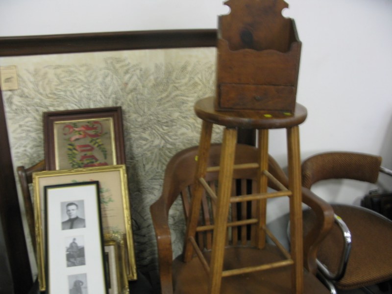Large group lot including trunk, chairs, genealogy tree framed, card table, chairs, and stool.