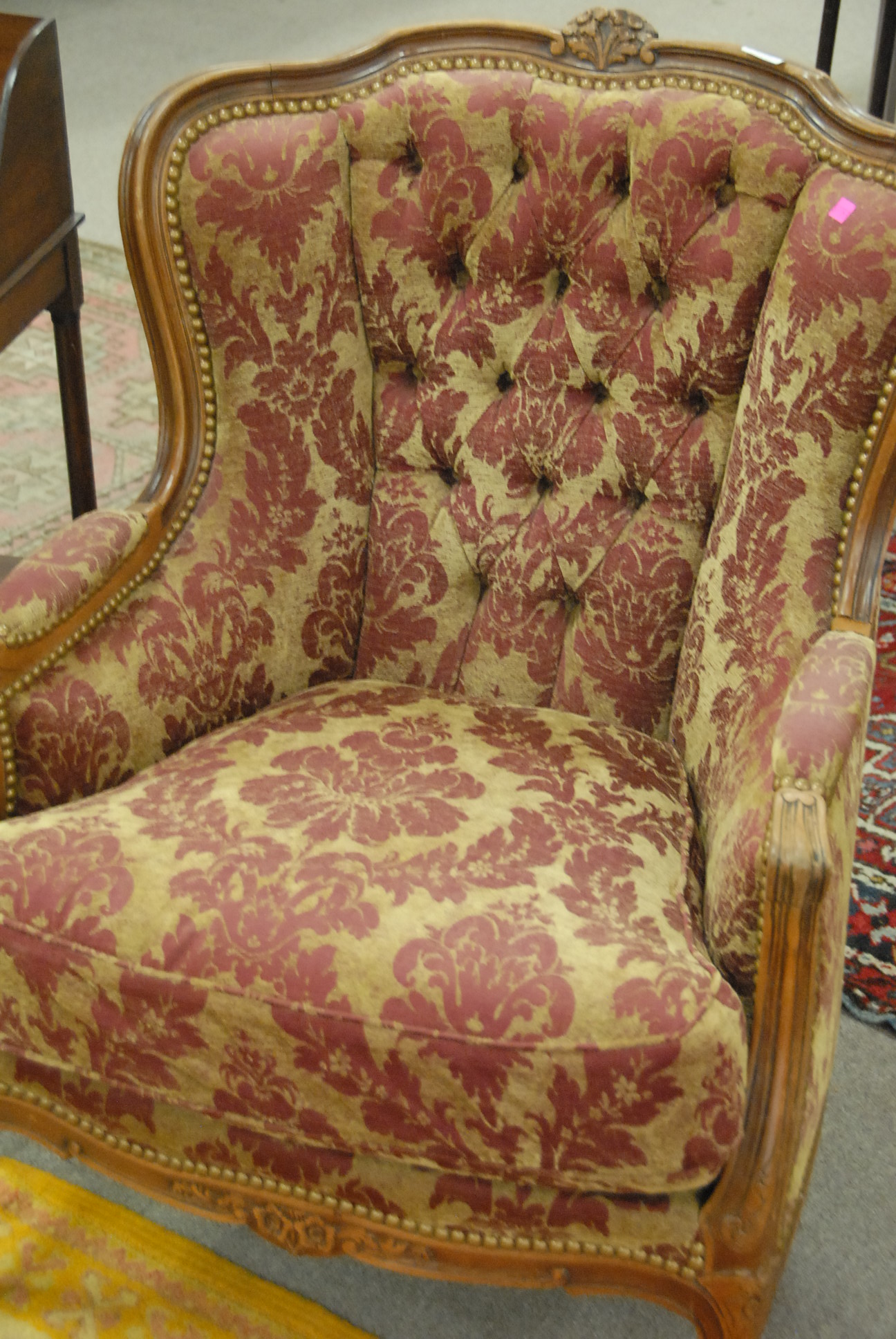 Louis XV style chair with tan and maroon upholstery.