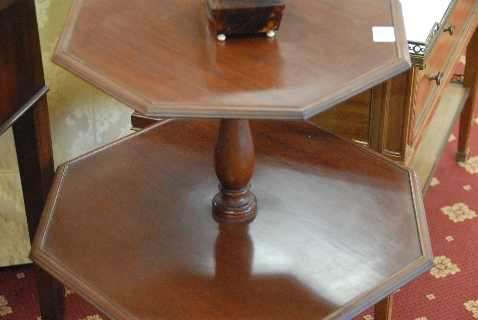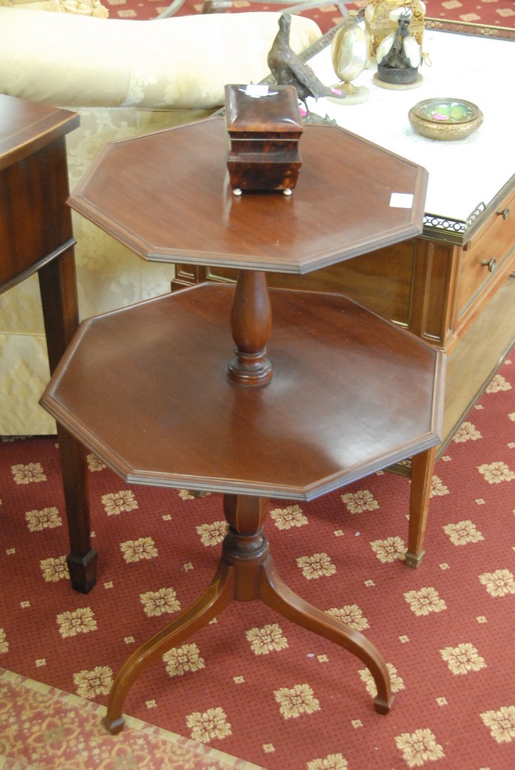 Mahogany Margolis two tier stand with inlaid legs. ht. 32 in.