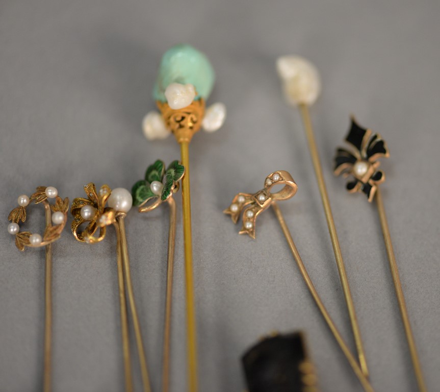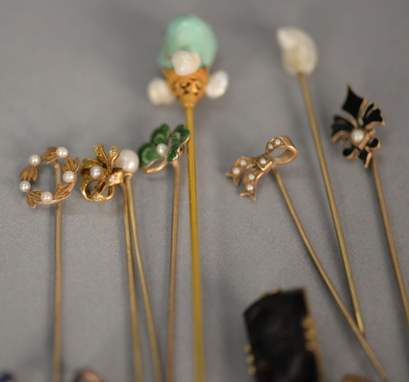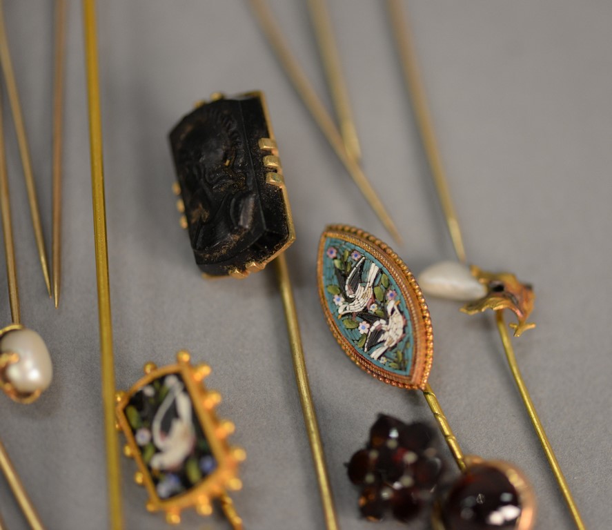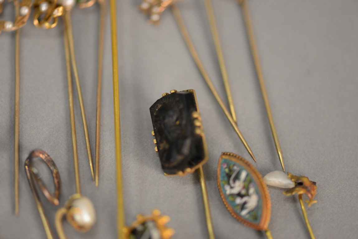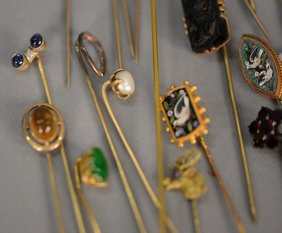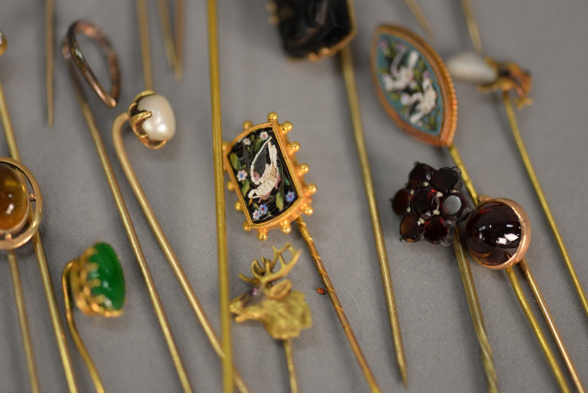 Lot 12: Nineteen piece lot including 18 stick pins and a 14K gold hat pin mounted with turquoise, pins include some gold, emerald, micro mosaic, enameled, and more. lg. 2 1/2 in. – lg. 9 in.