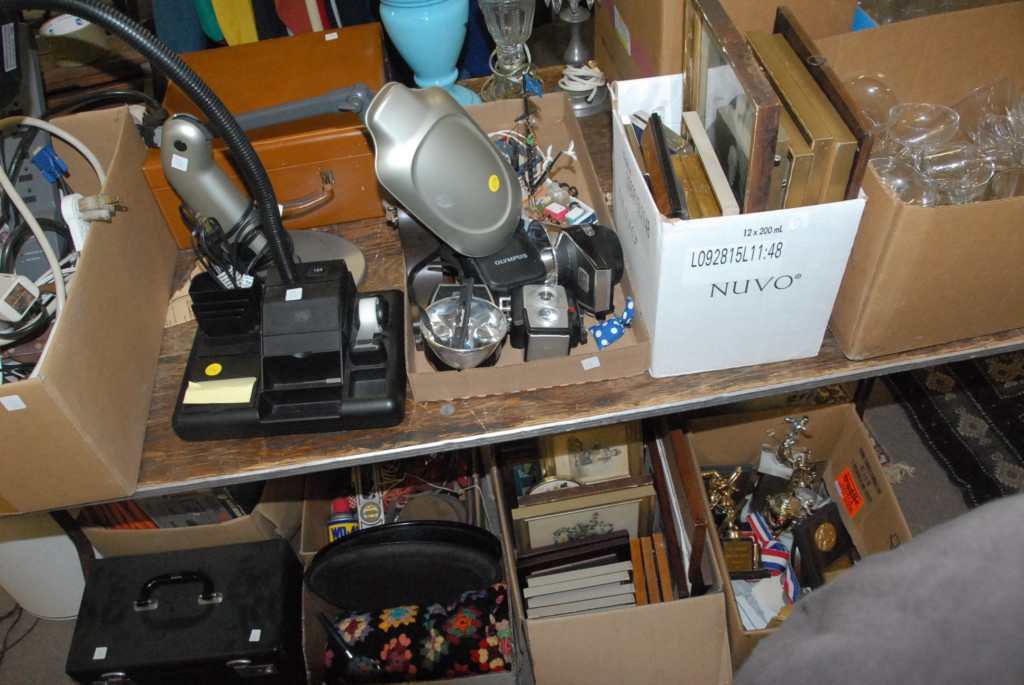 On top and below table lamps, electronic items, stemware, prints, jumper cables, tools, etc.