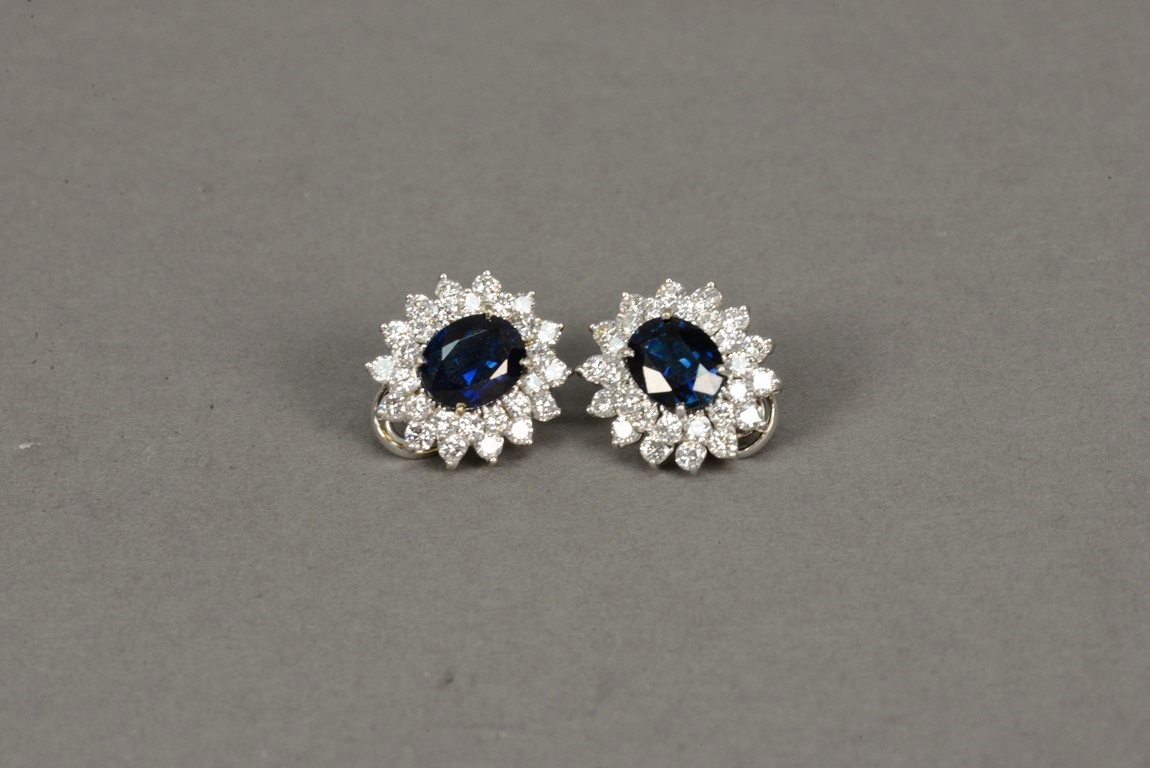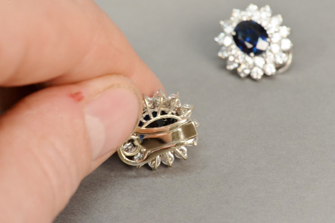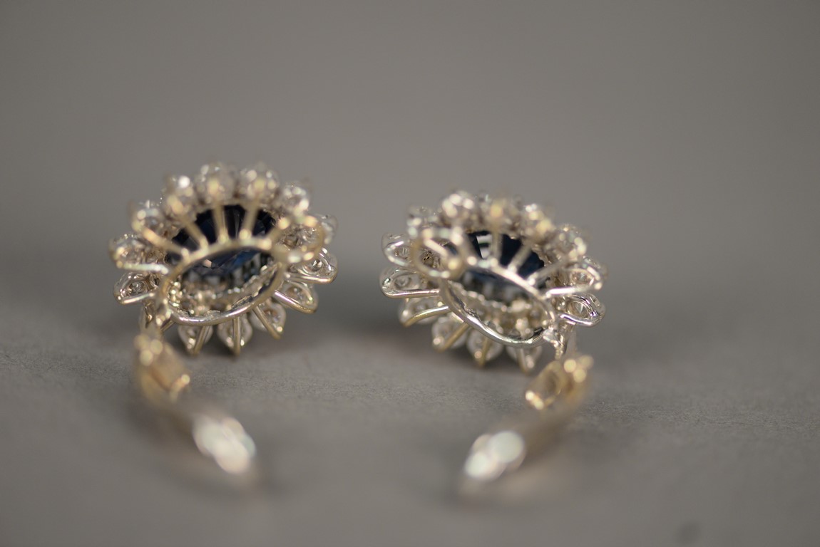 Lot 12: Pair of non-pierced prong set sapphire and diamond earrings in 14K tested white gold with clip backs. Each earring centers one ova…