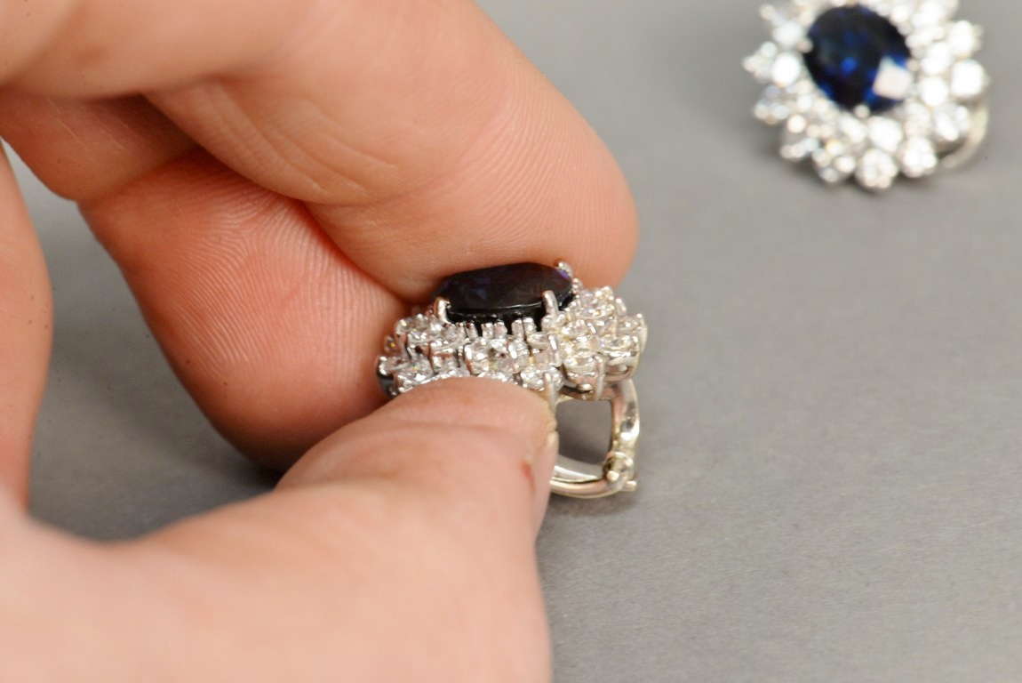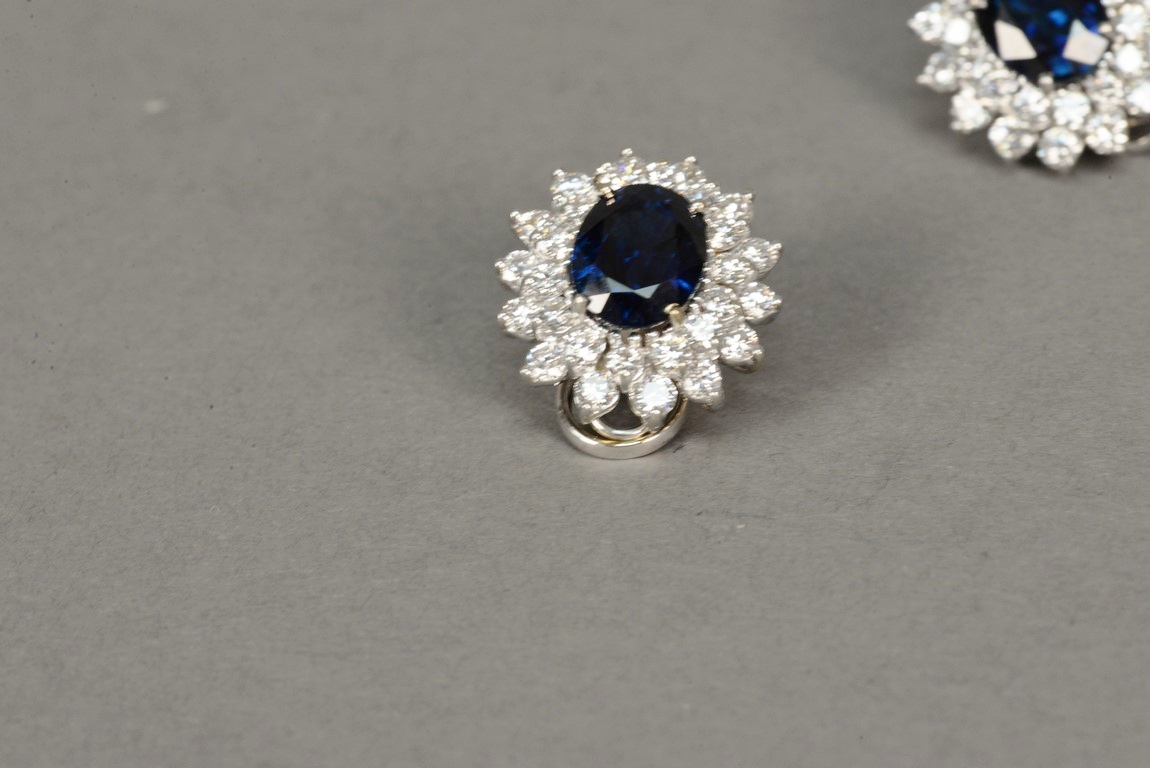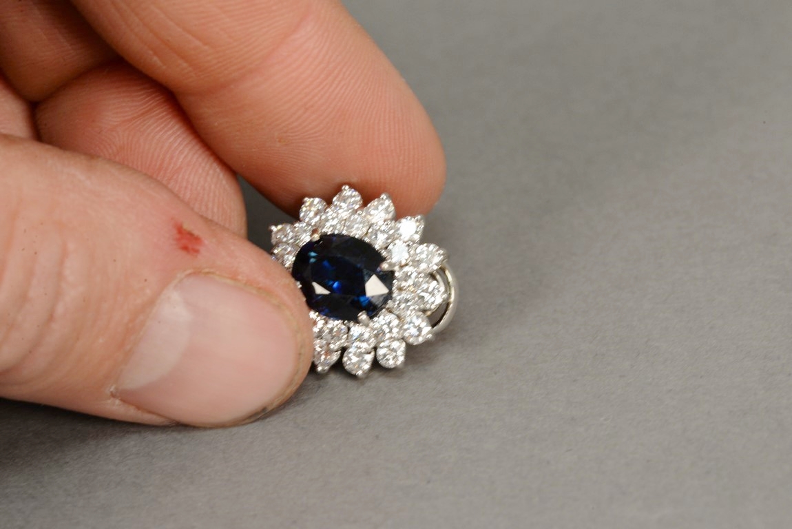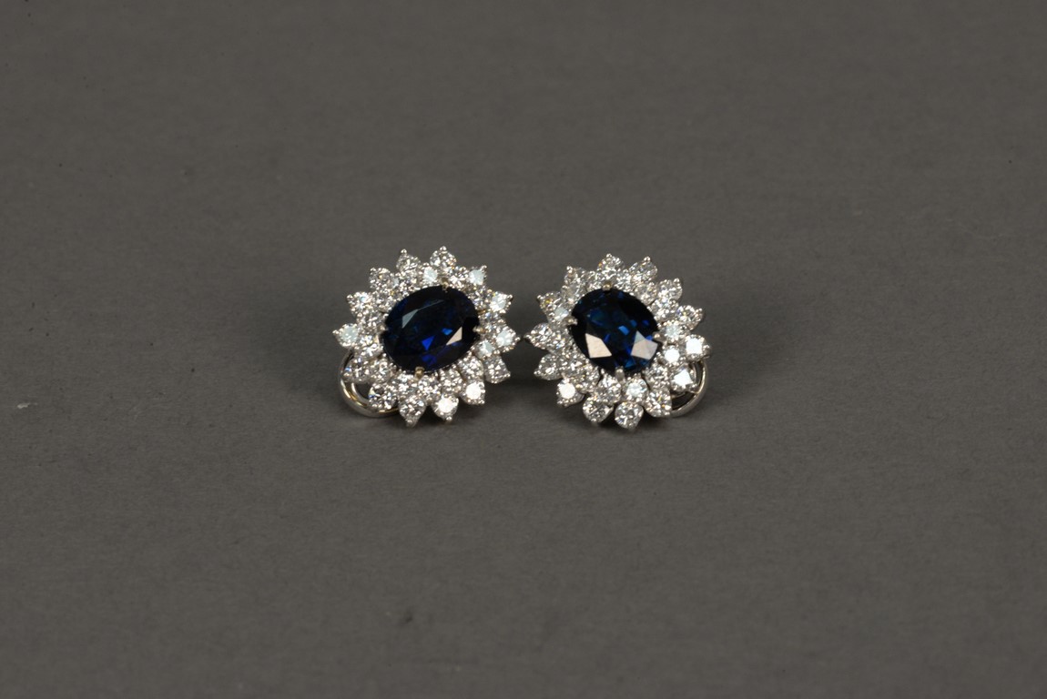 Lot 12: Pair of non-pierced prong set sapphire and diamond earrings in 14K tested white gold with clip backs. Each earring centers one ova…