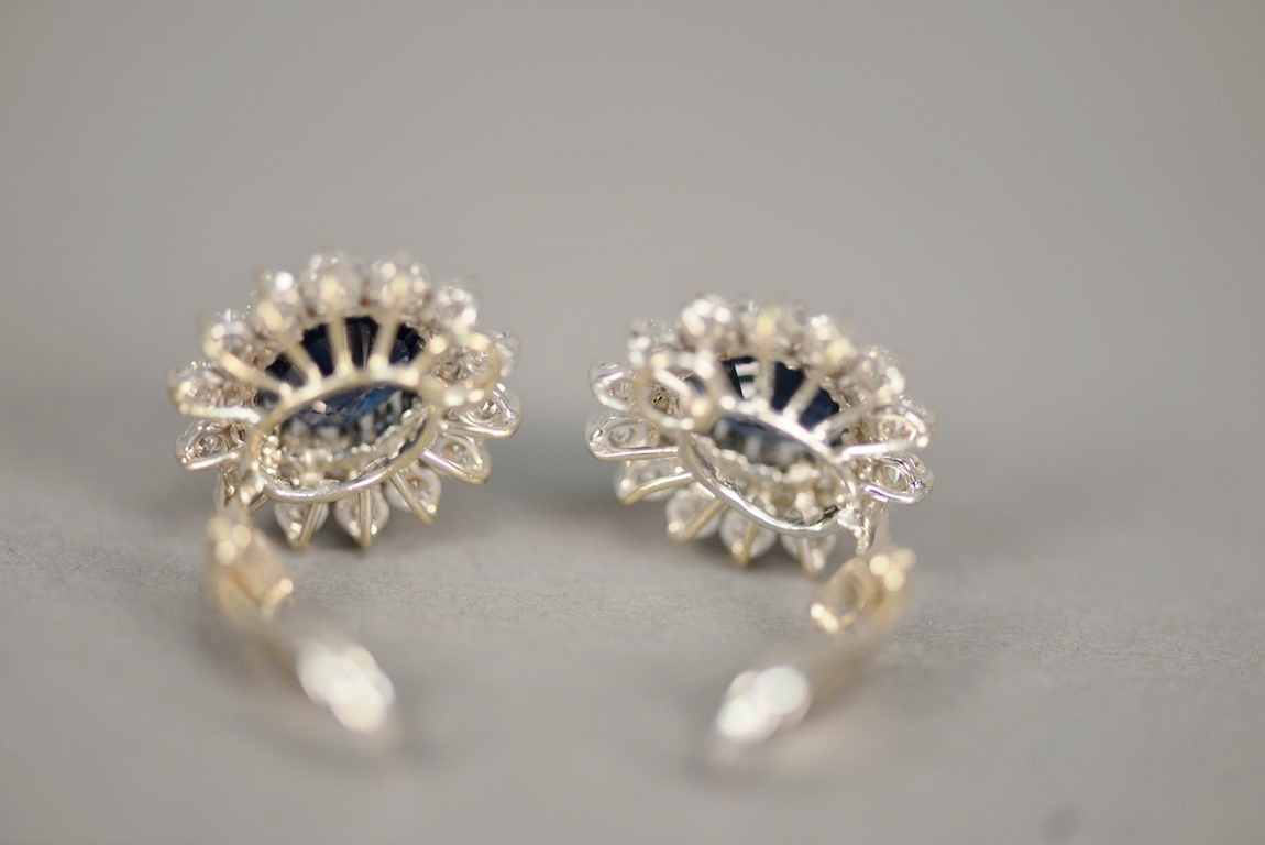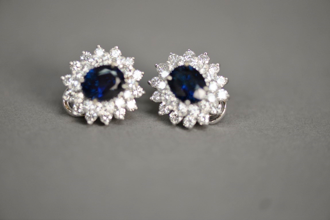 Pair of non-pierced prong set sapphire and diamond earrings in 14K tested white gold with clip backs. Each earring centers one oval faceted sapphire surrounded by two rows of fourteen 14 round brilliant cut diamonds a total of fifty-six 56 diamonds. The earrings measure approximately 3/4 x 5/8 and weighs a total of 12.5 grams, including the stones. Total estimated sapphire weight – 6.90 carats. Total estimated diamond weight – 2.66 carats, color G-H, clarity SI.