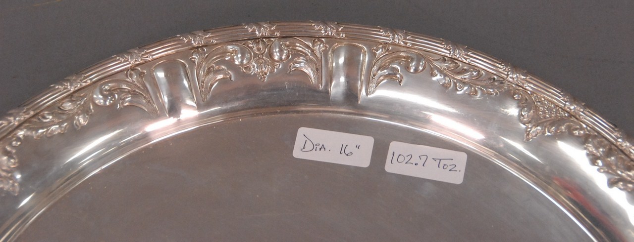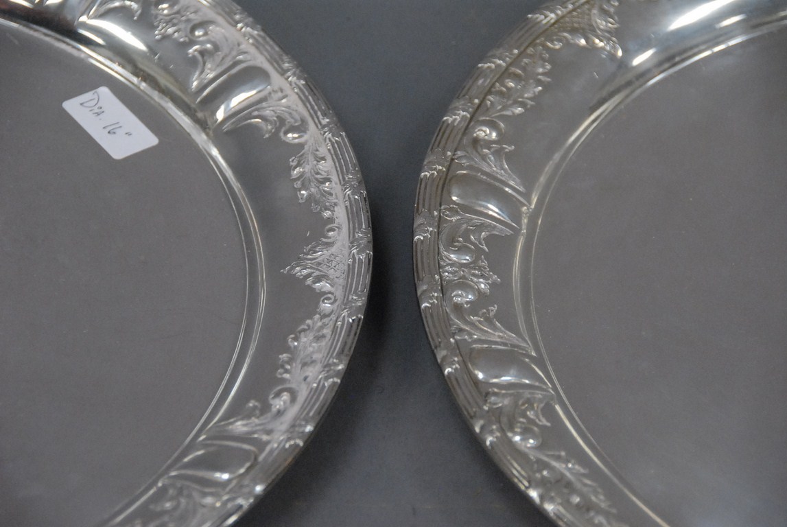 Pair of sterling silver round trays by Fisher, hand chased. dia. 16in. 102.7 t oz.