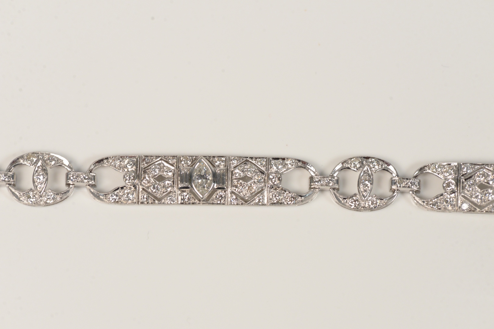 Lot 12: Platinum and Diamond Bracelet set with three marquis diamonds, each flanked by emerald cut diamonds, set with all over round diamond…