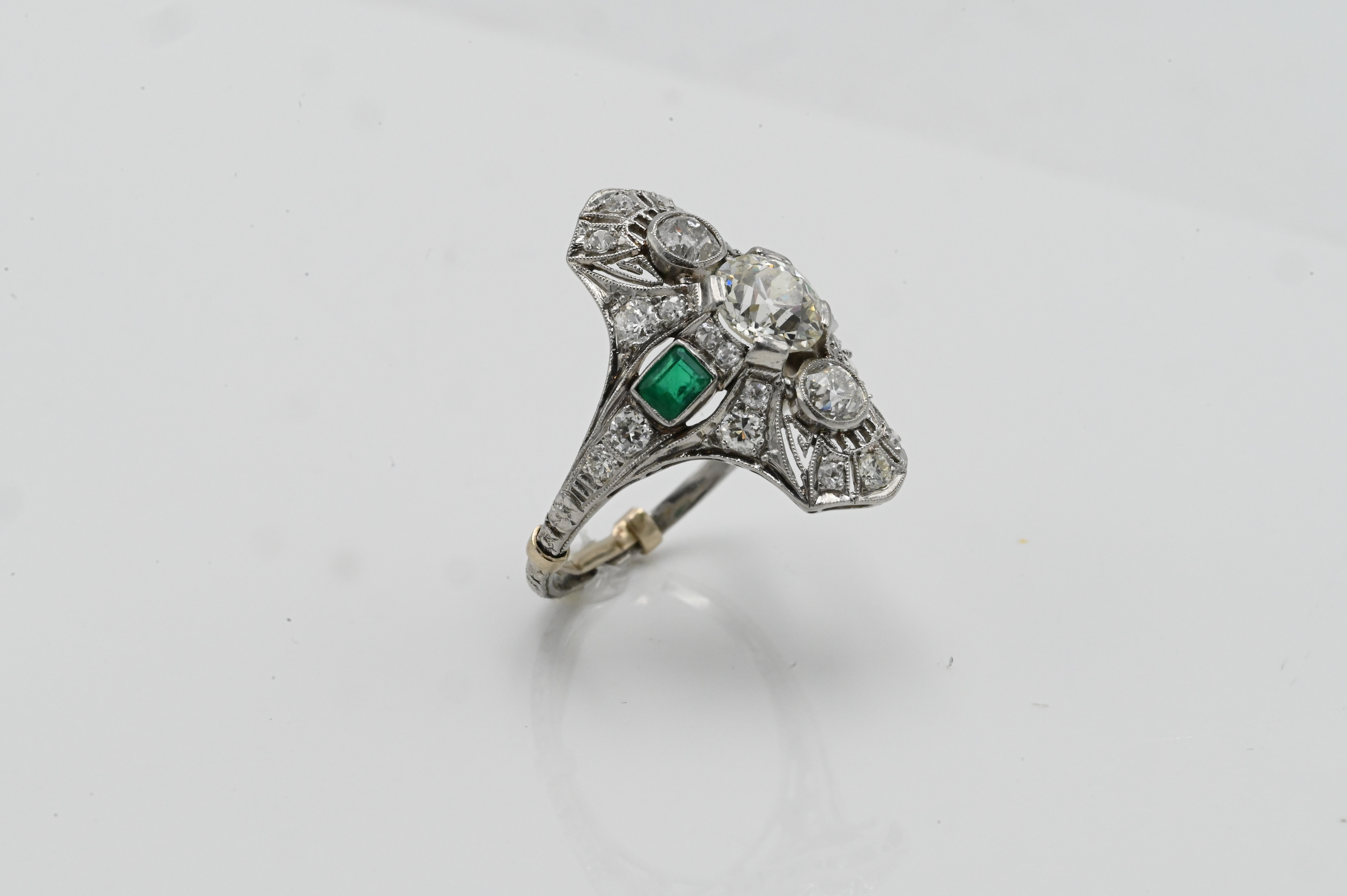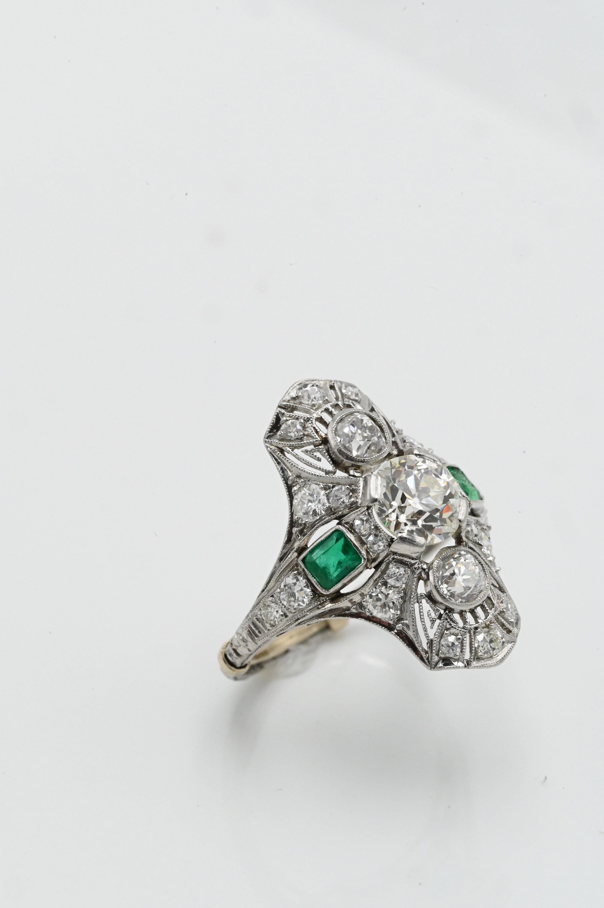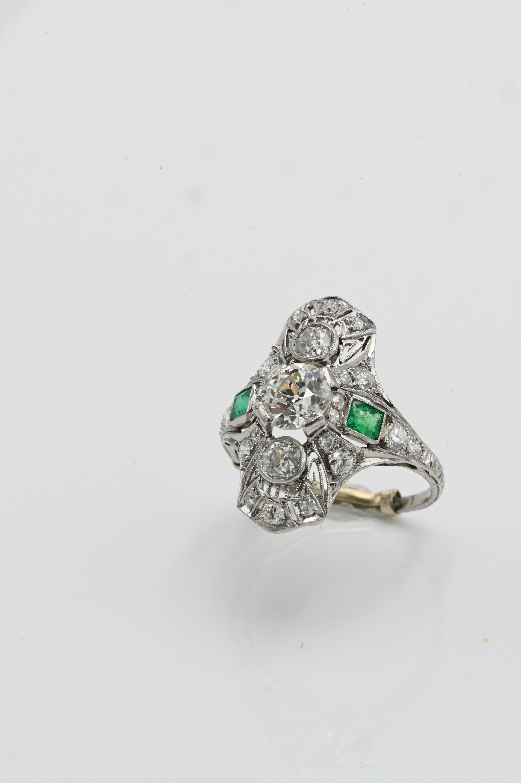 having center diamond 7.2 mm in filigree setting mounted with small diamonds above and below flanked by emeralds and small diamonds