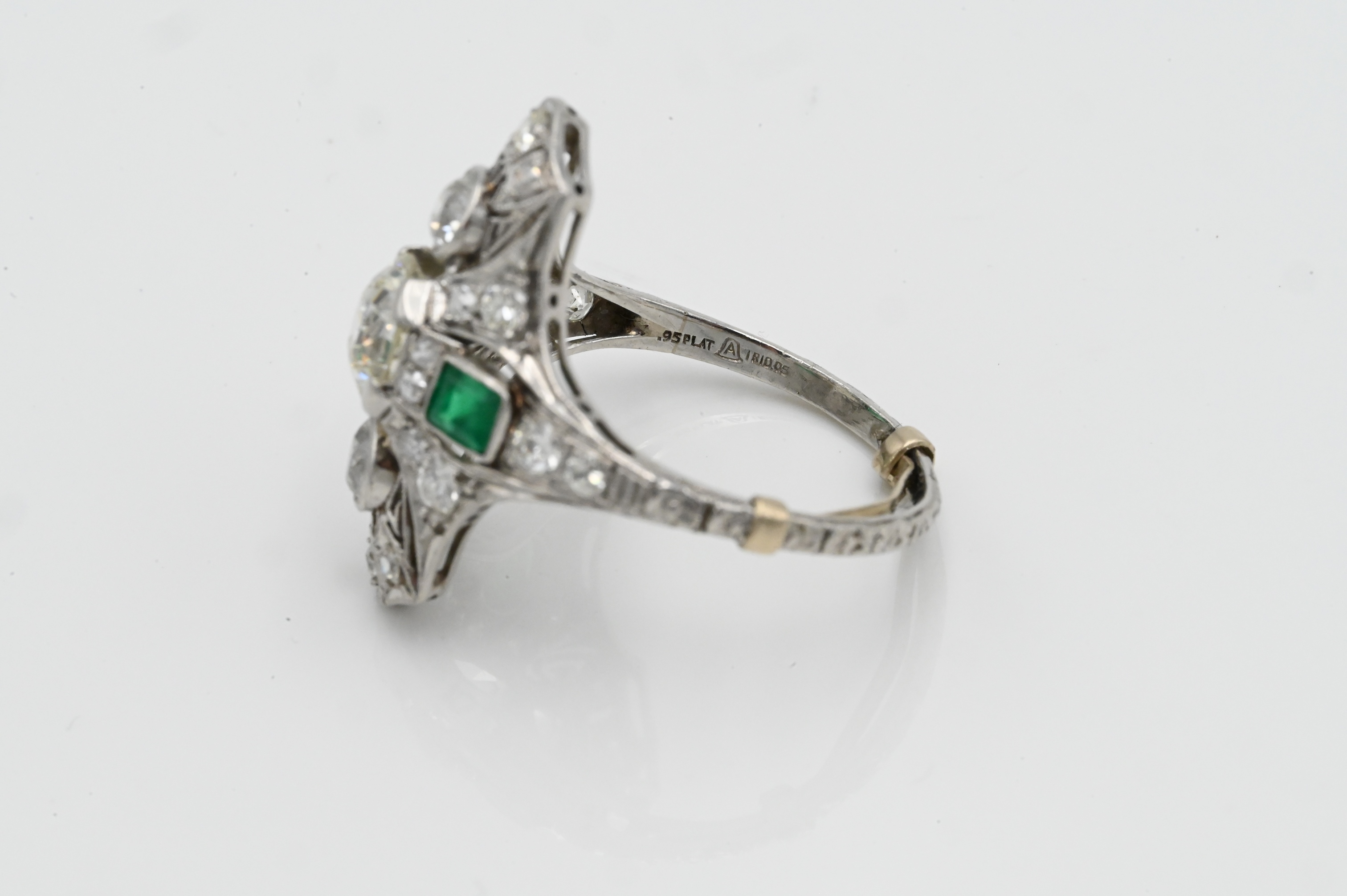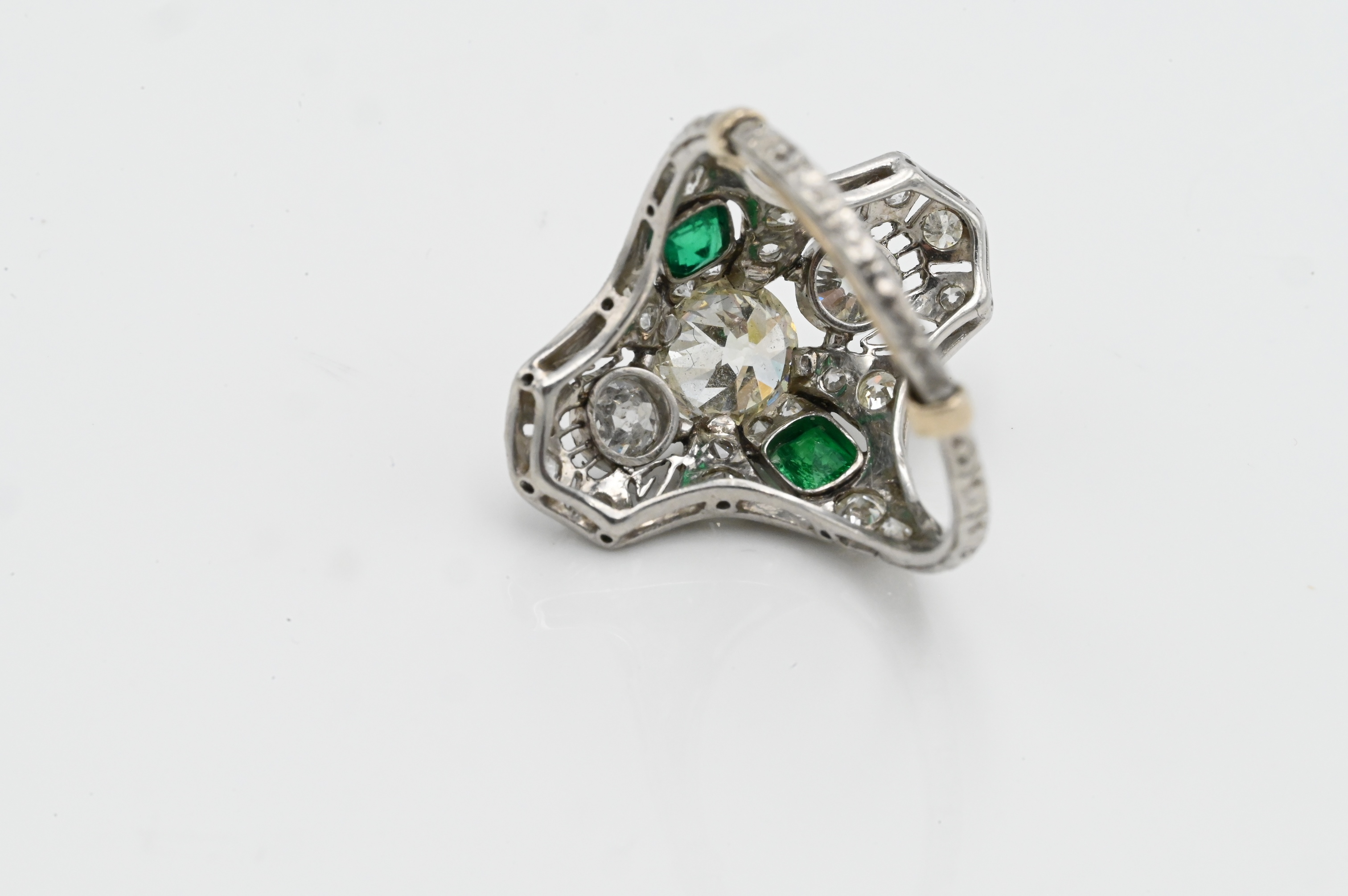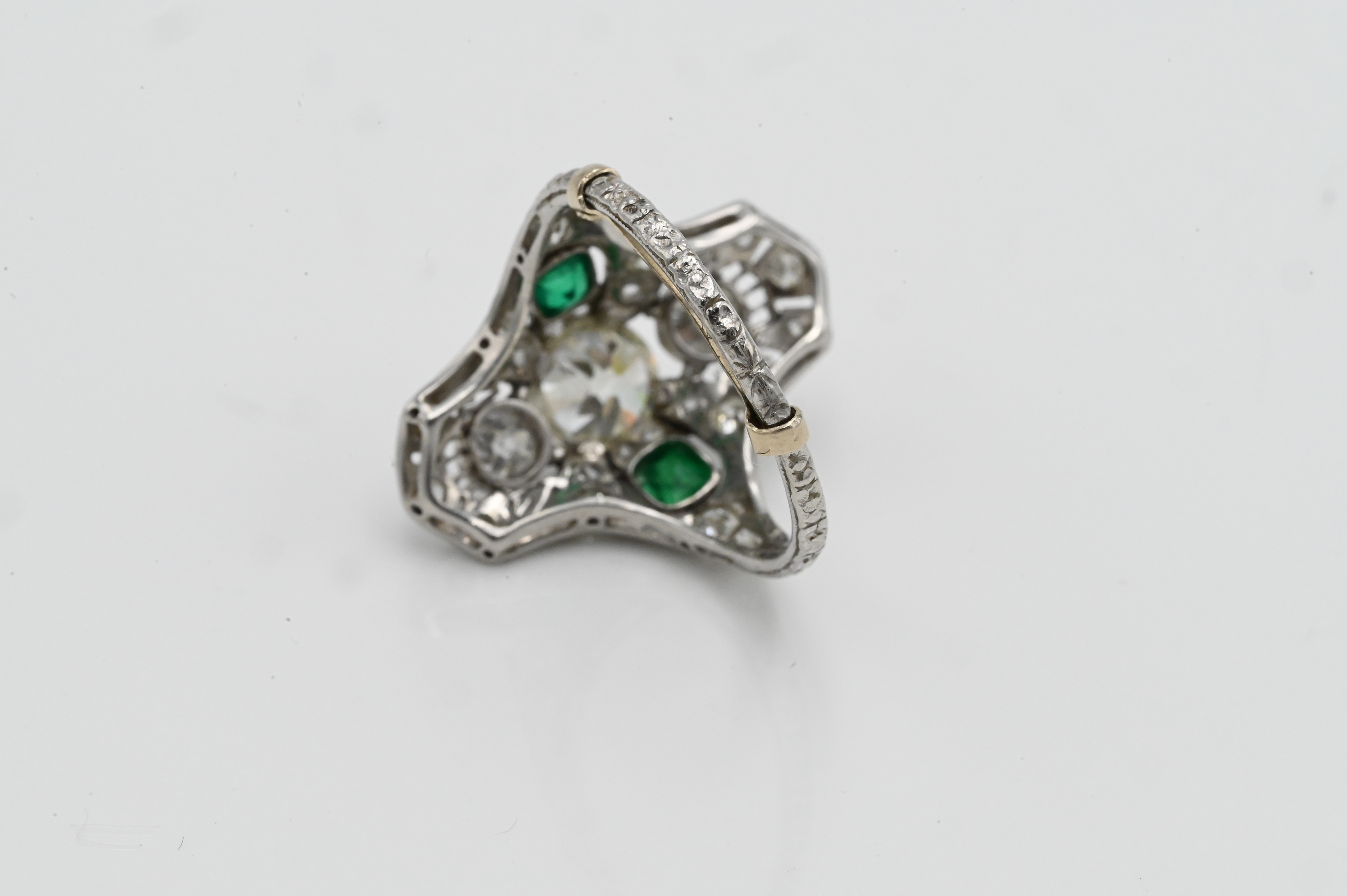 having center diamond 7.2 mm in filigree setting mounted with small diamonds above and below flanked by emeralds and small diamonds