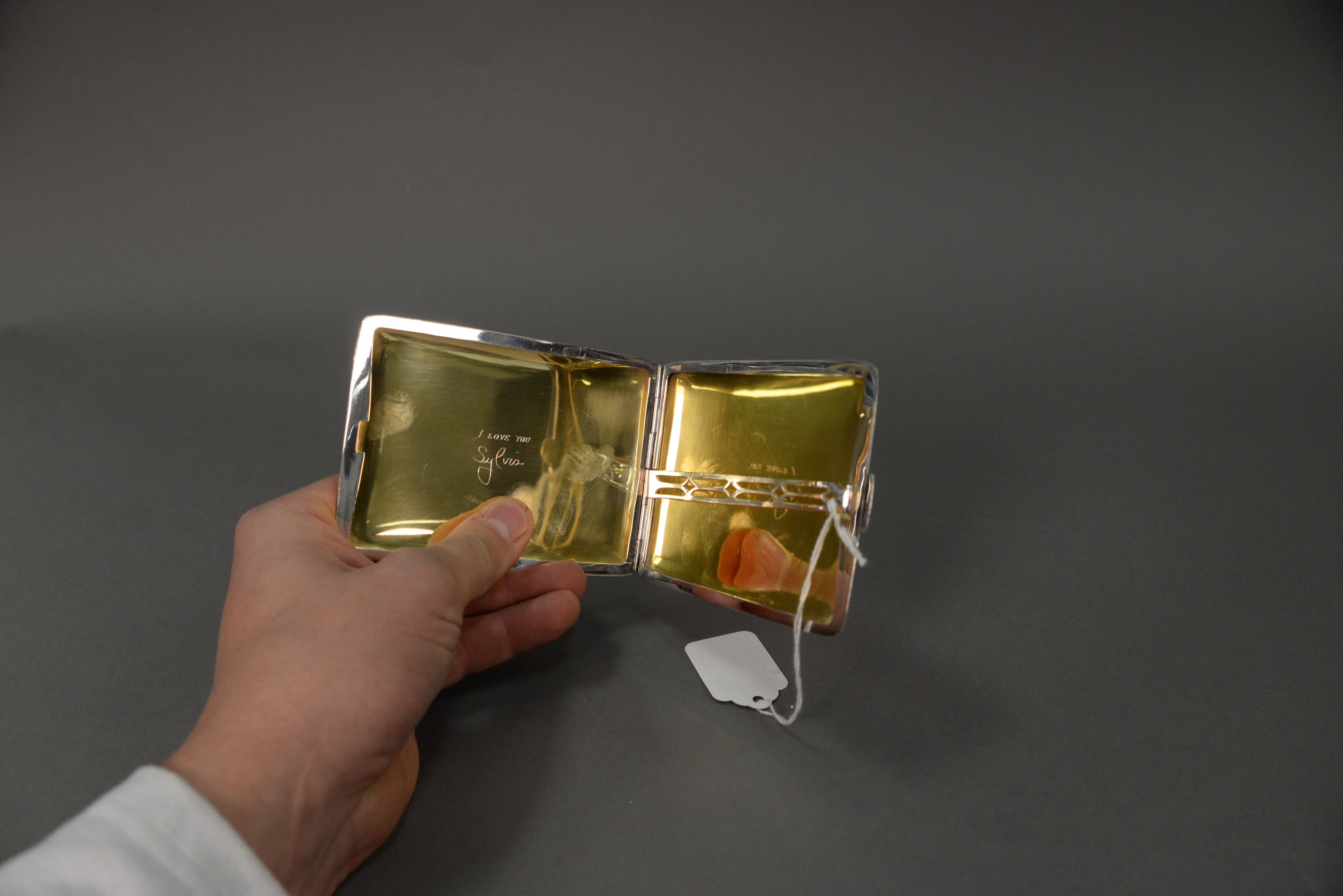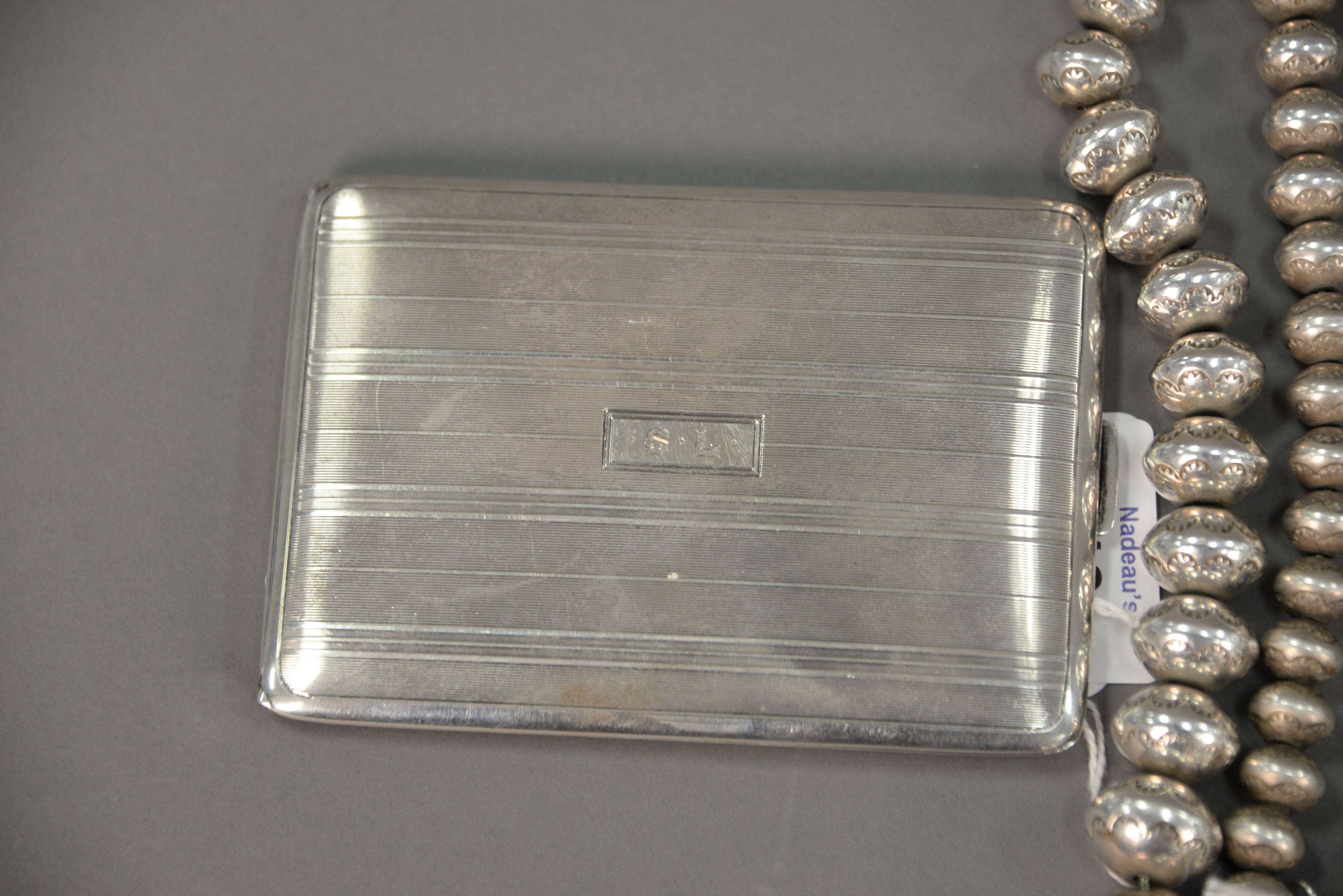 Silver lot including cigarette case and beaded necklace. 11.2 t oz.
