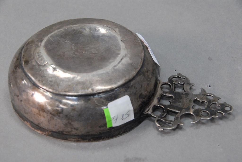 Lot 12: Silver porringer with pierced handle marked MS on handle, possibly by John Cooney, Boston, 18th century. 5.8 t oz.