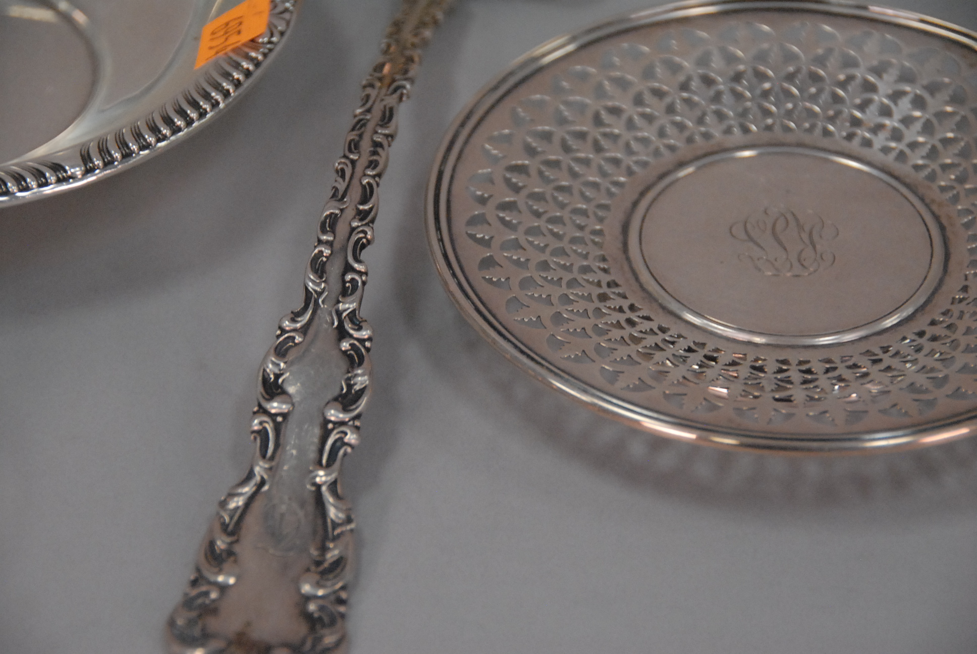 Sterling silver lot to include ladle, porringer, dish, and plate, 12.6 t oz.