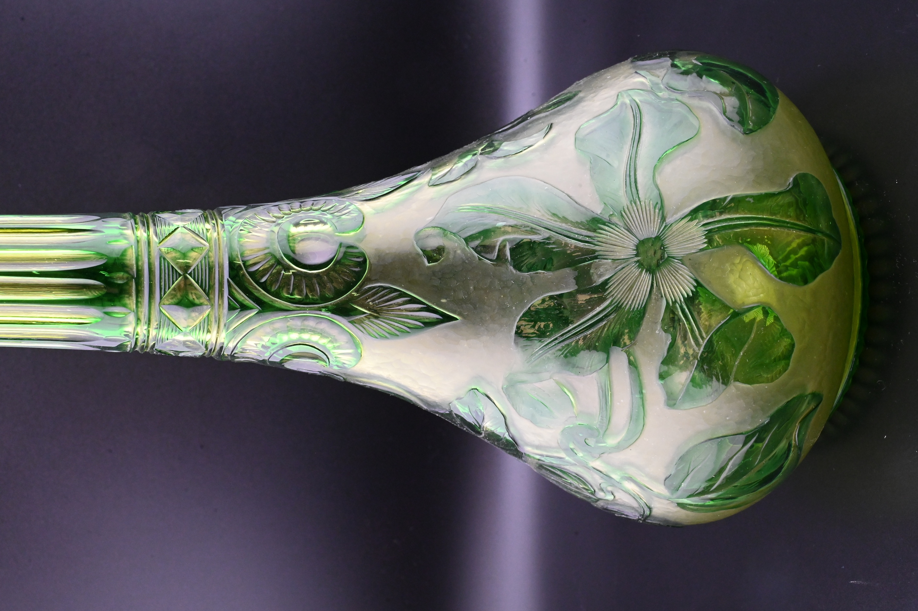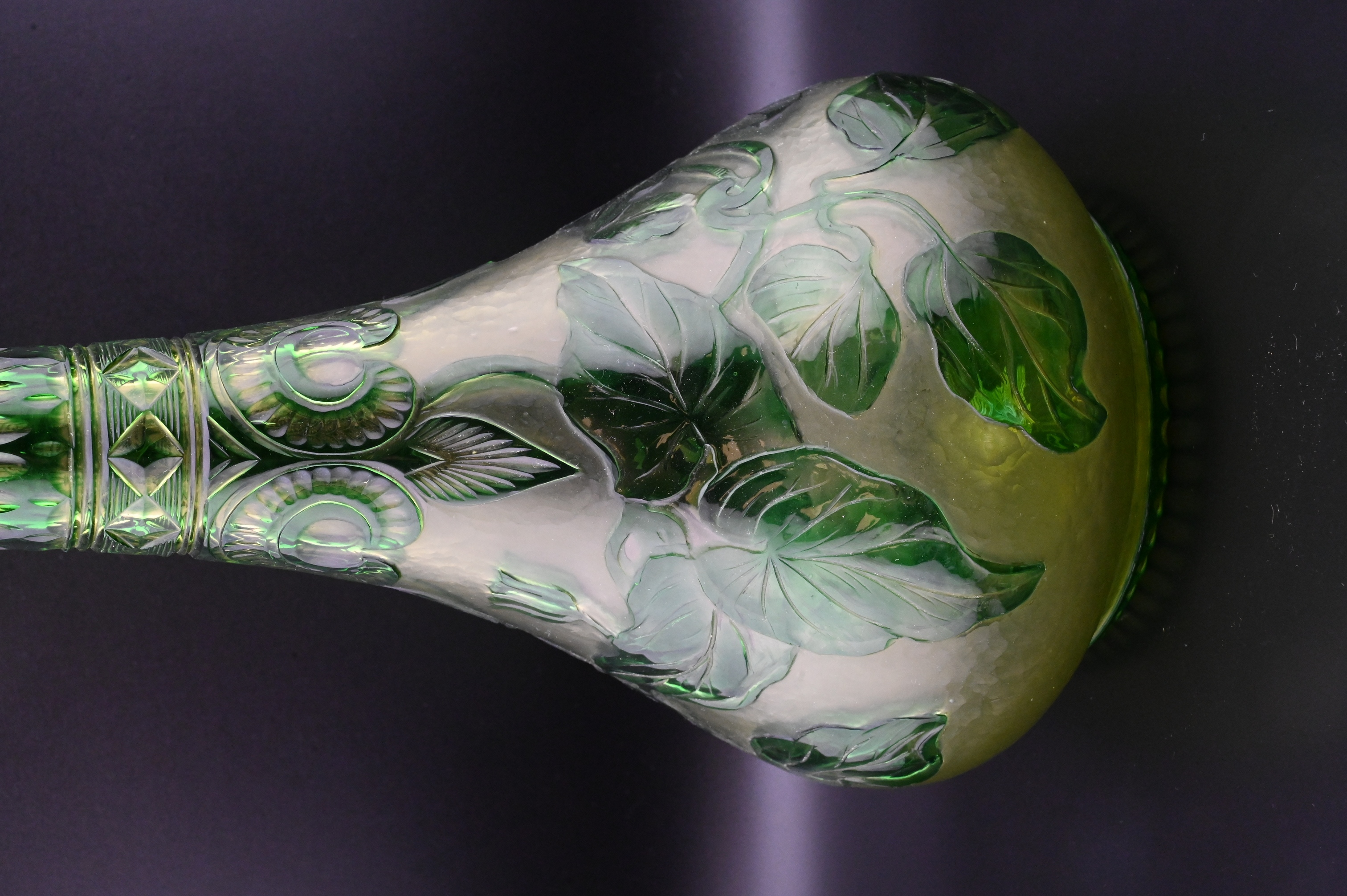 the bulbous body carved in high relief with trailing leaves and blossoms, rising to a long faceted neck, matching carved stopper