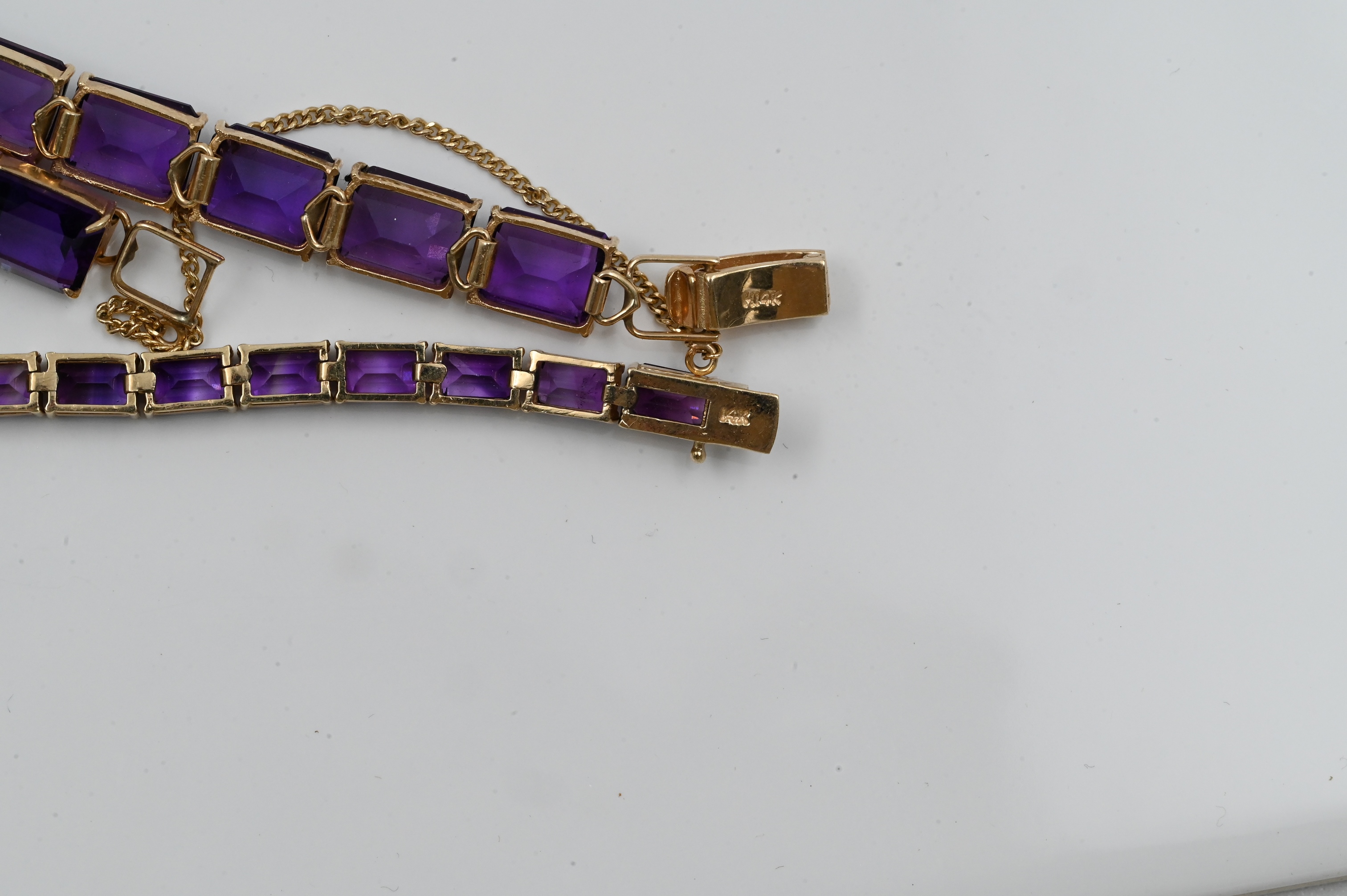 one having 26 rectangle amethyst set in 14K gold, the other having 15 large rectangular amethysts set in 14K gold, marked “H 14K”