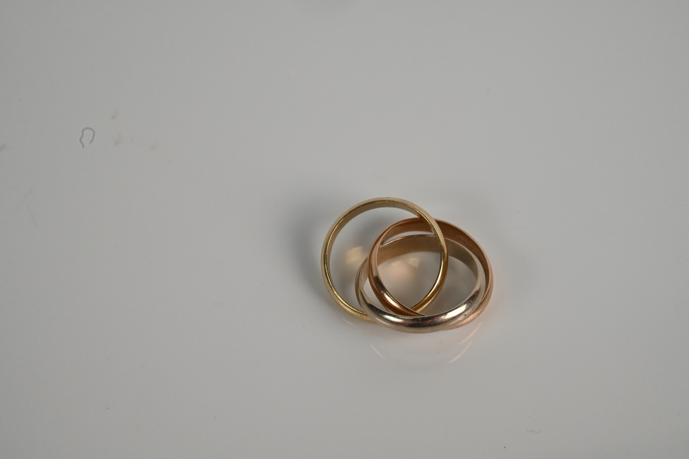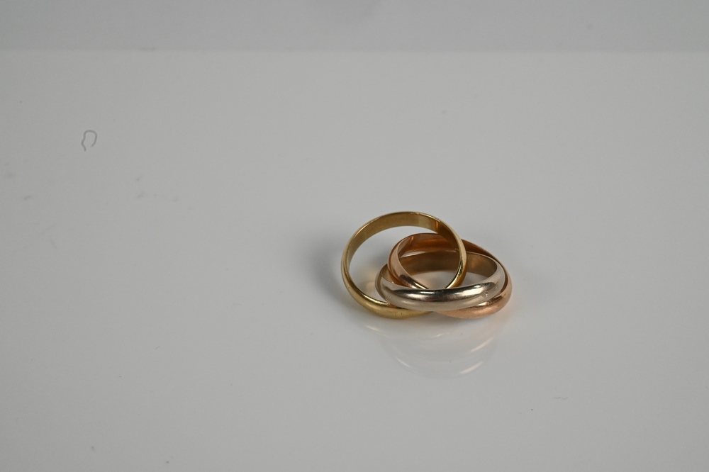 Lot 120: 18 Karat Cartier Trinity Ring, in three colors of gold, marked 750, size 7 ½, 12 grams.