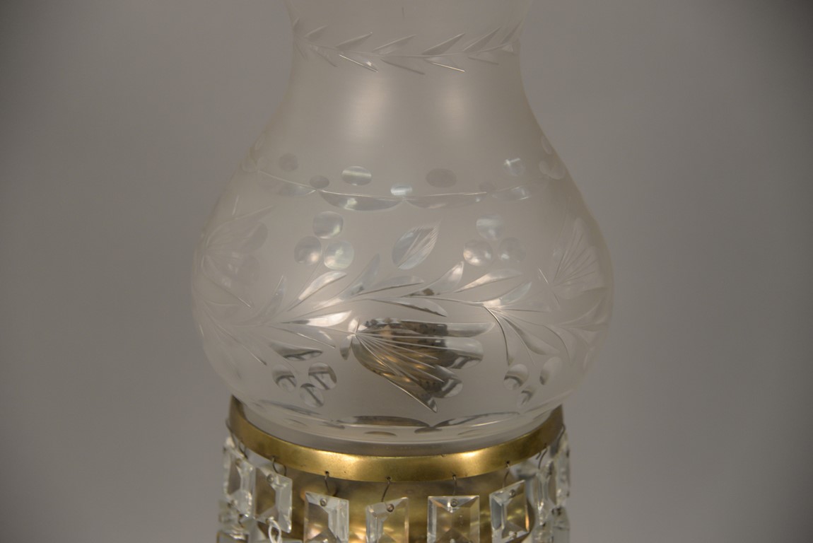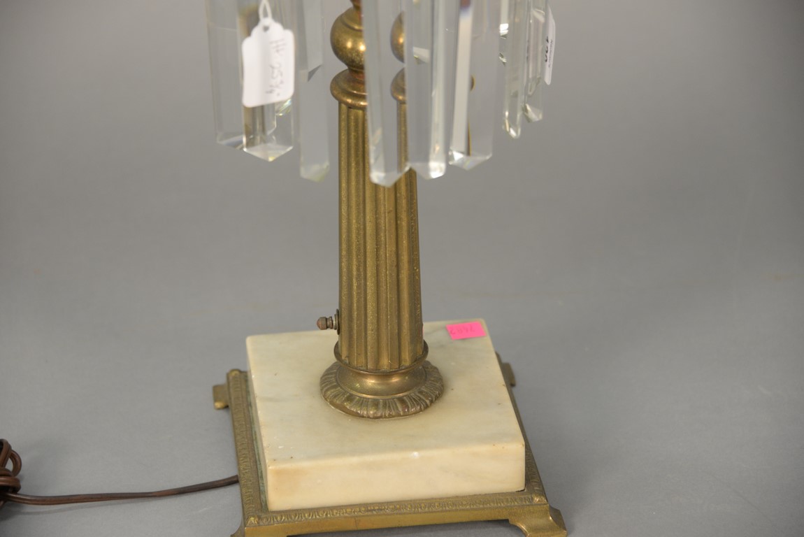 Lot 120: Astral type lamp with frosted to clear shade with prisms on brass base with marble on brass feet. total ht. 25 3/4 in.