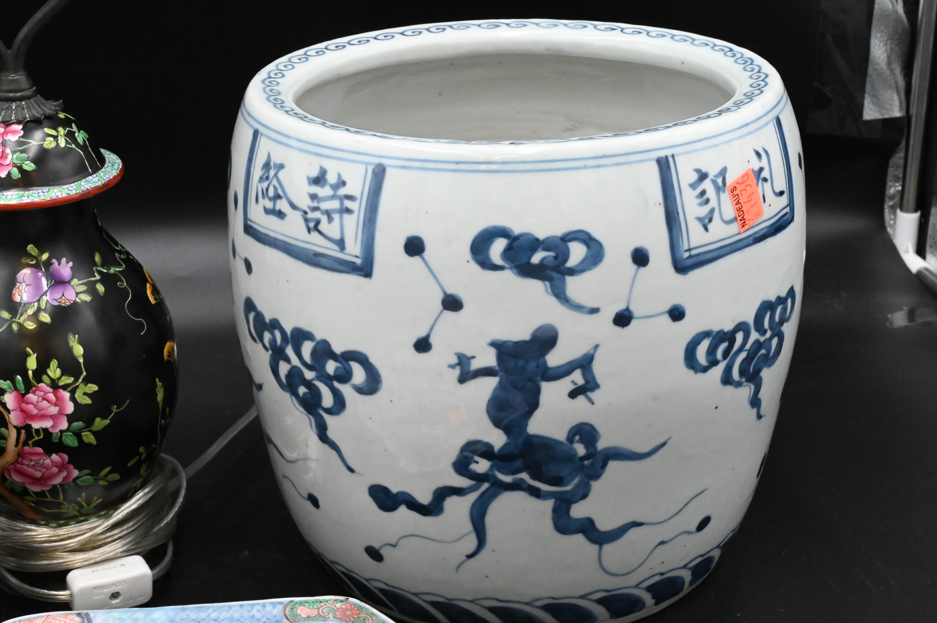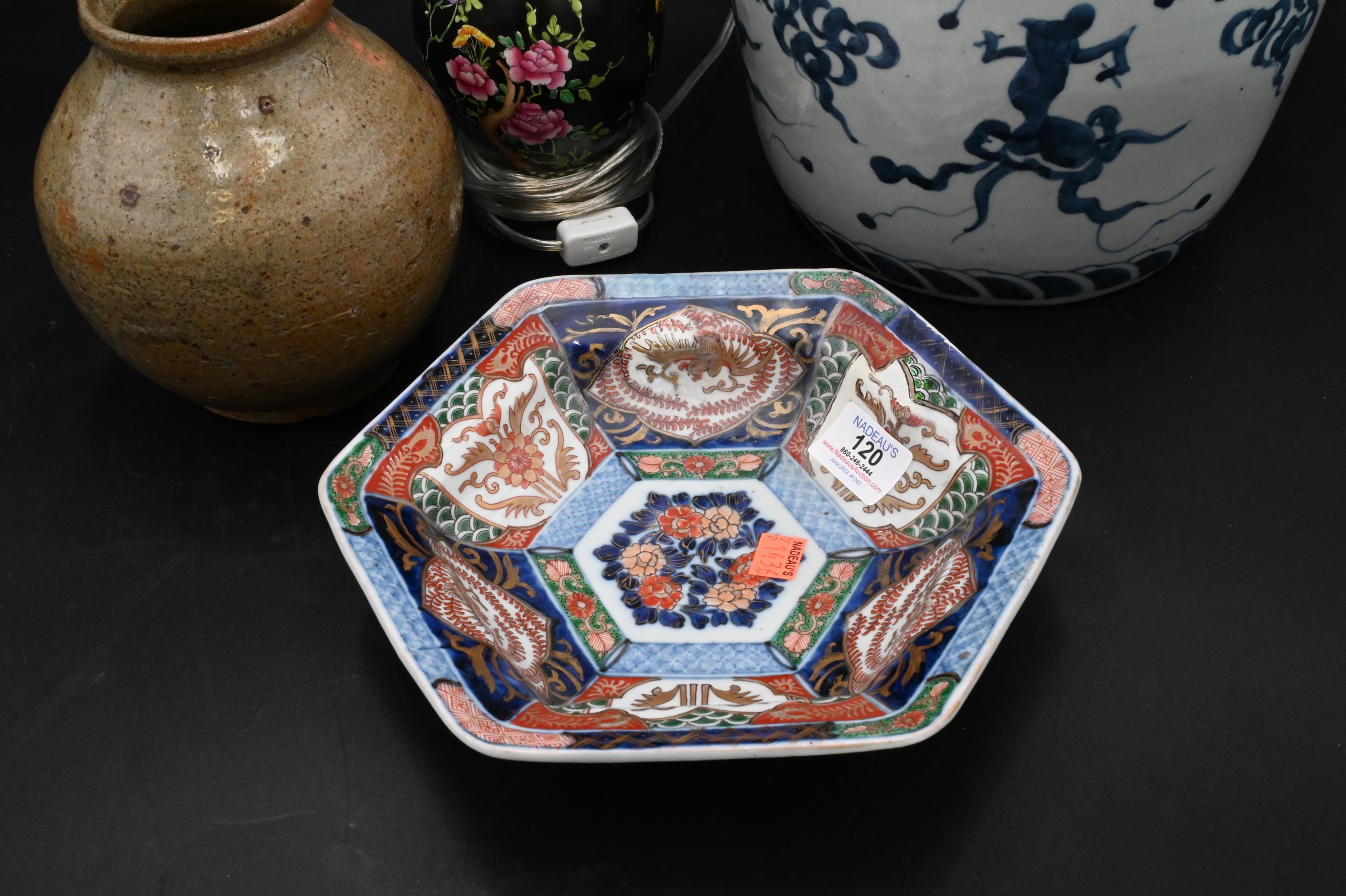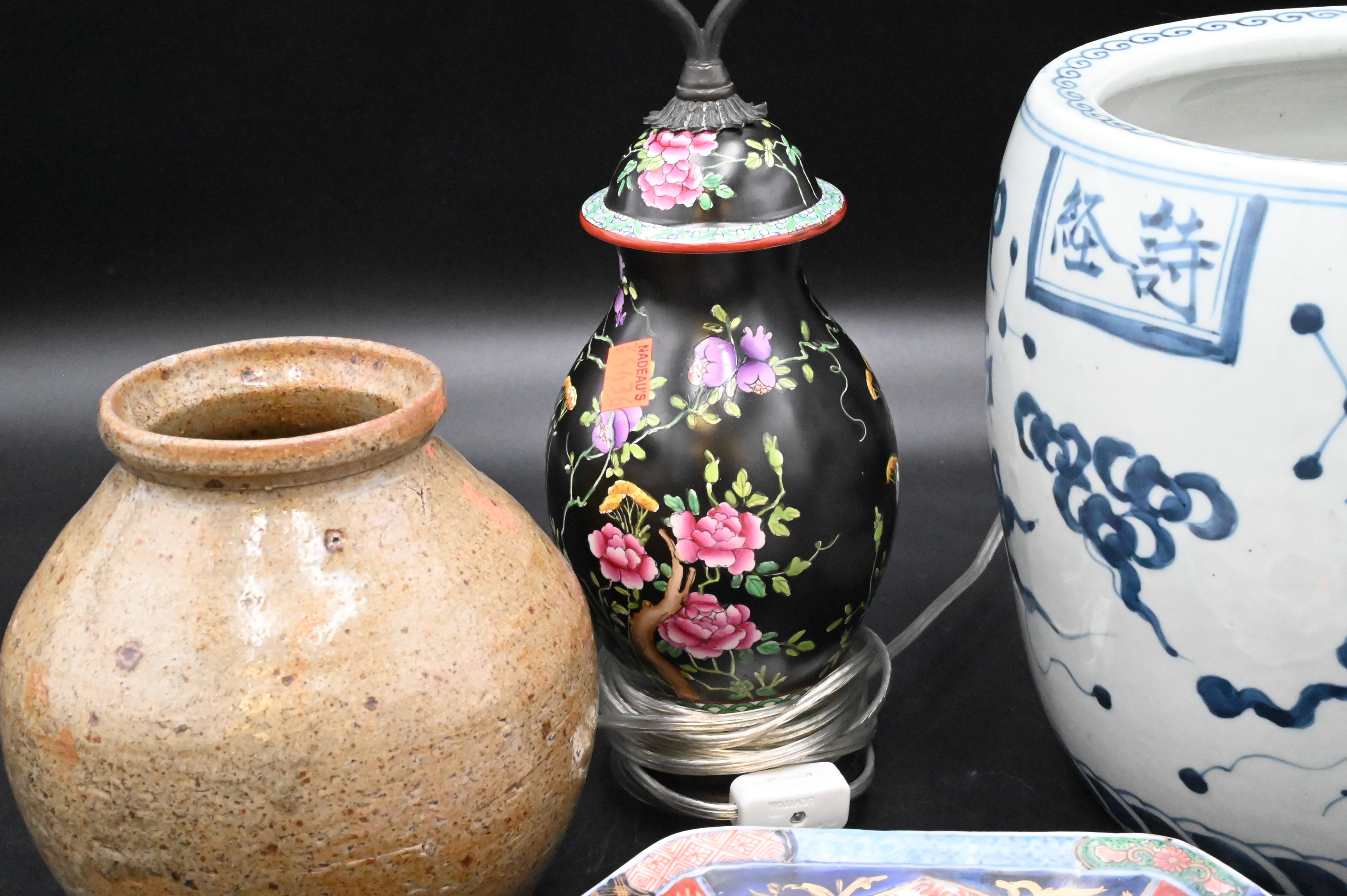 Four Piece Japanese & Chinese Group, to include chinese blue and white porcelain barrel form jar, decorated with characters, probably 19th century, height 8 3/4 inches, A Varatsu Ceramic Vase, height 7 inches, Provenance Naga Antiques LTD. NY, along with imari porcelain hexogonal dish, diameter 9 1 /2 inches, and a famille rose jar with painted flowers made into a taple lamp, height 17 inches.