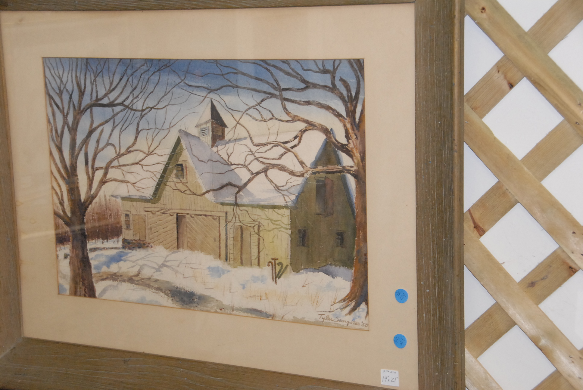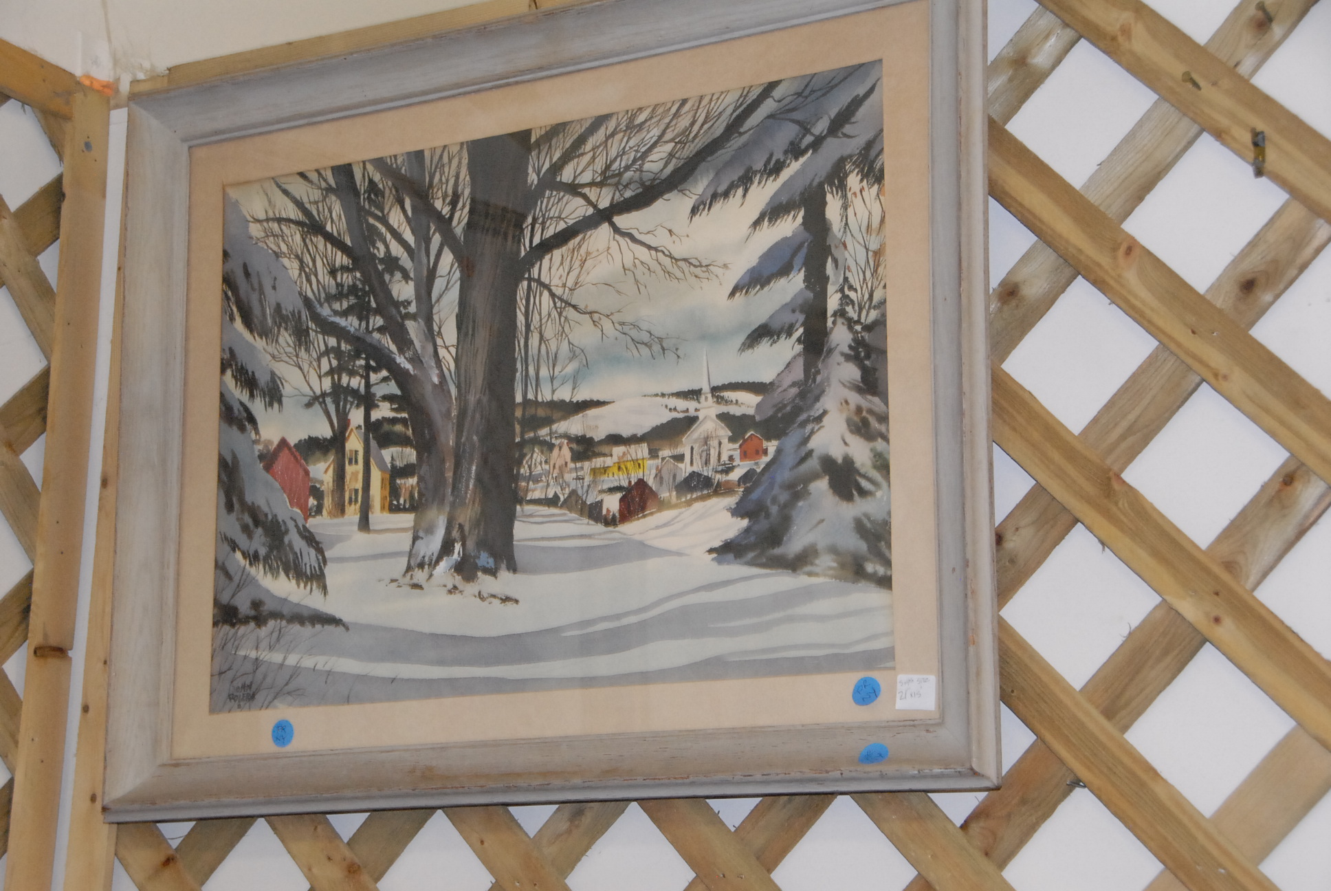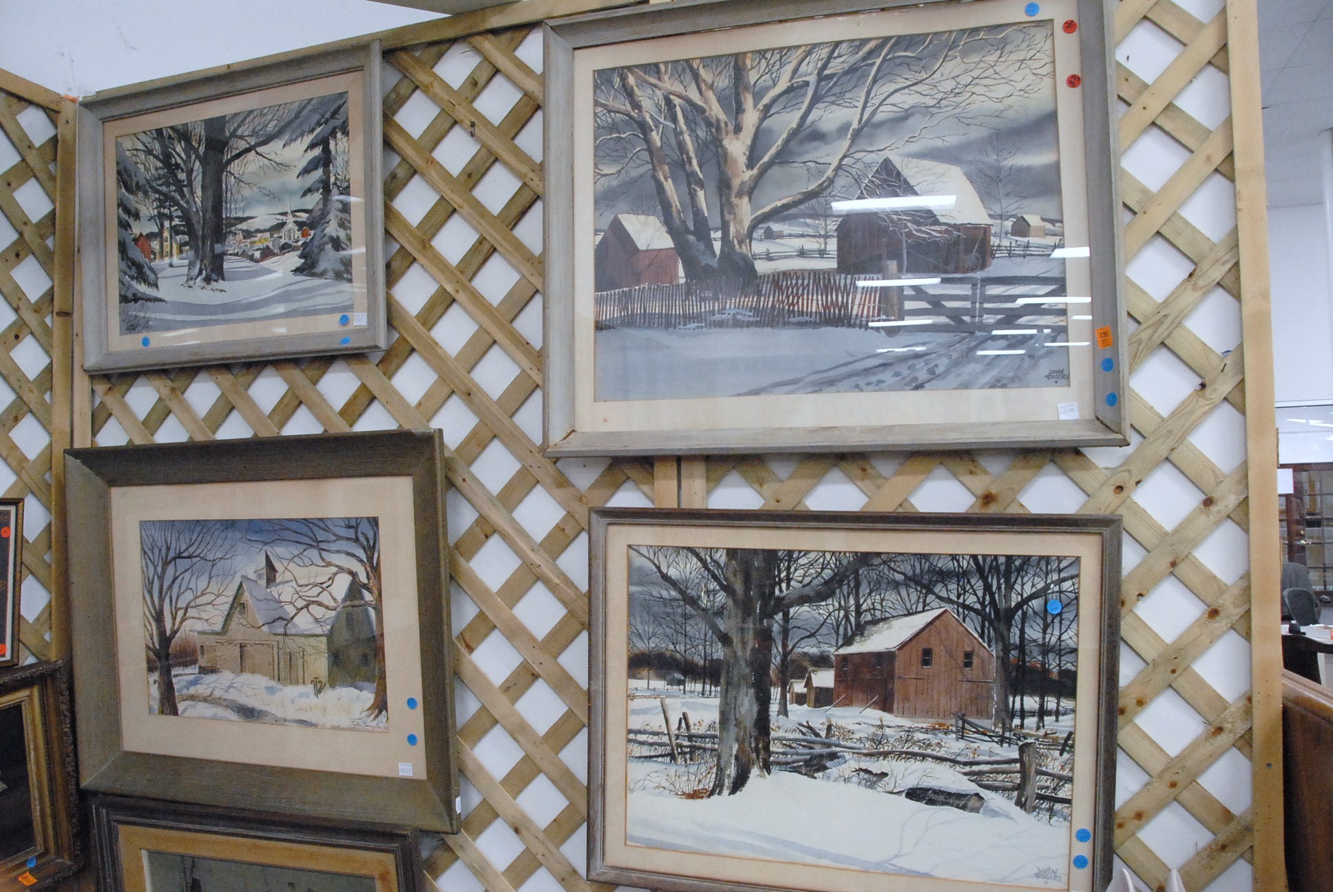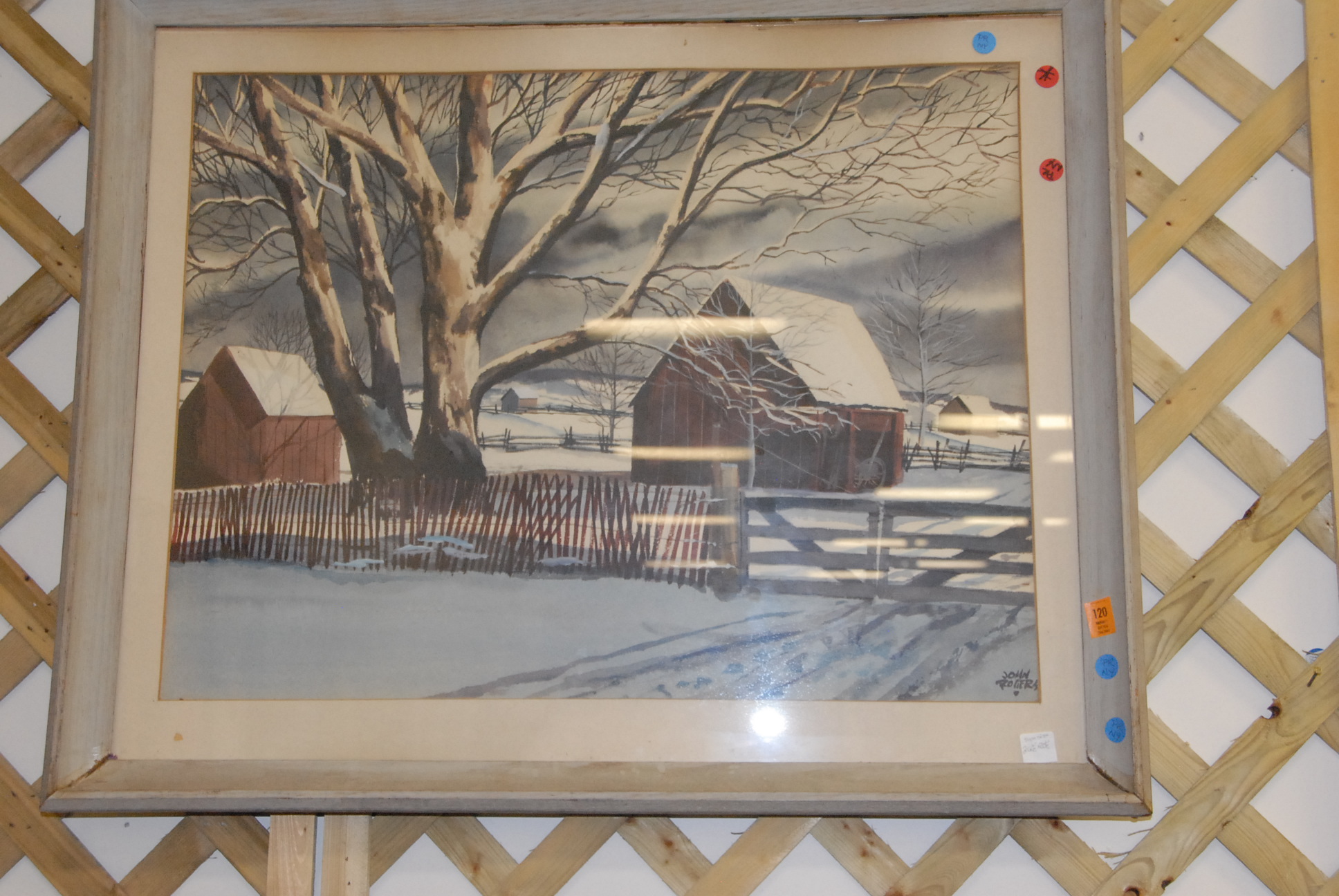 Four piece lot to include four John Rogers 1906-1985 watercolors, two snowscapes, barns, towns edge, along with a winter snow scape signed lower right, Songston 50′.