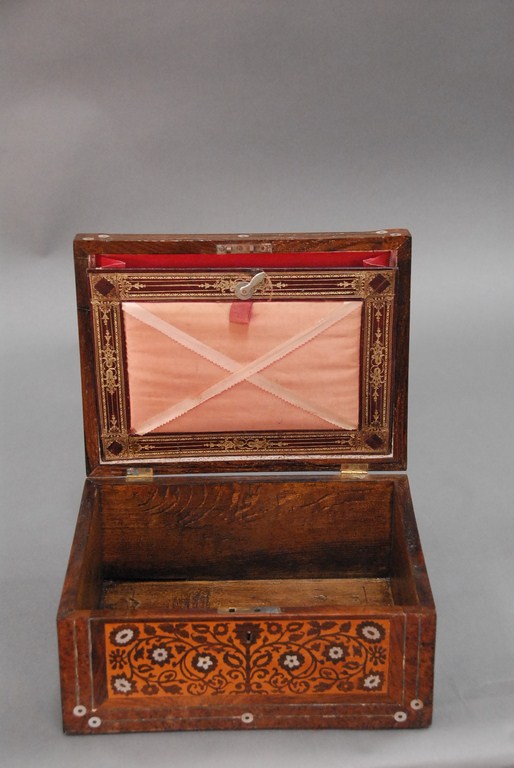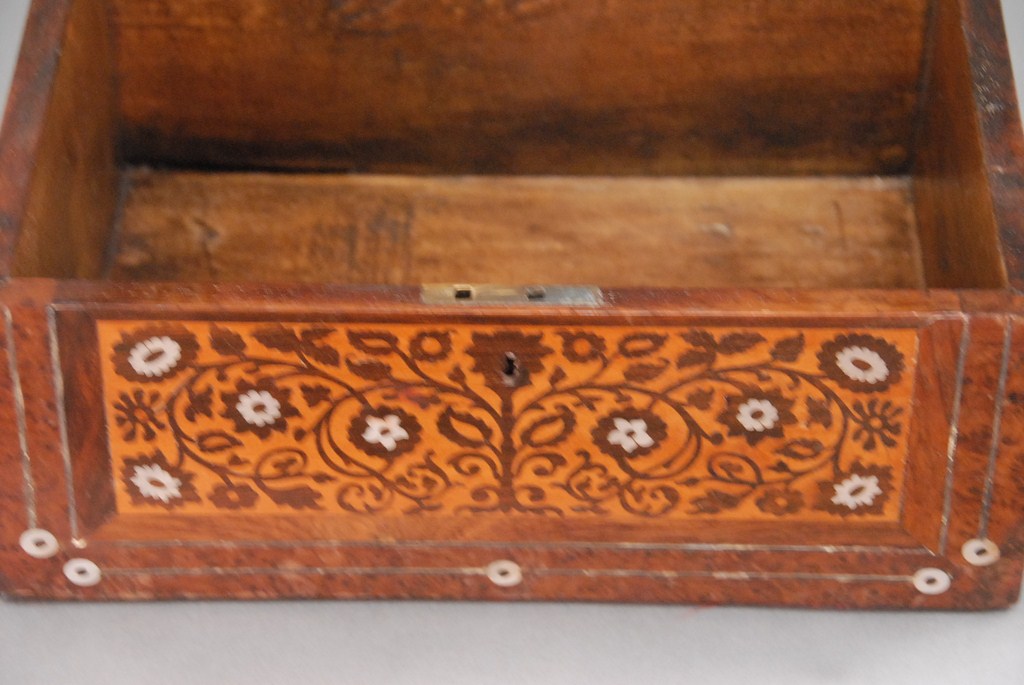 Inlaid letter box with mother of pearl and various wood inlays, ht. 6, lg. 12.