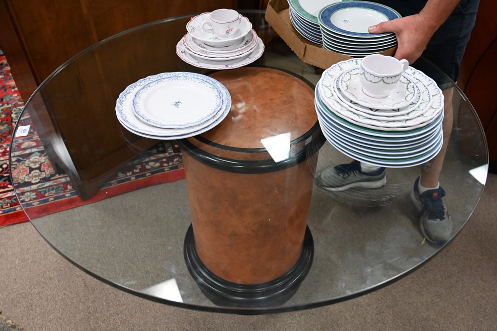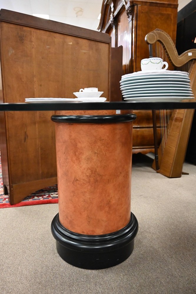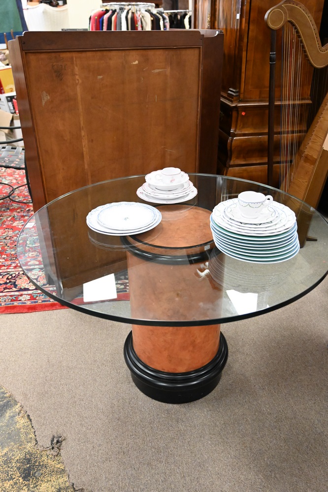 Lot 120: Karl Springer Style Glass Top Center Table, having burl pedestal base, not marked, height 29 inches, diameter 44 inches.