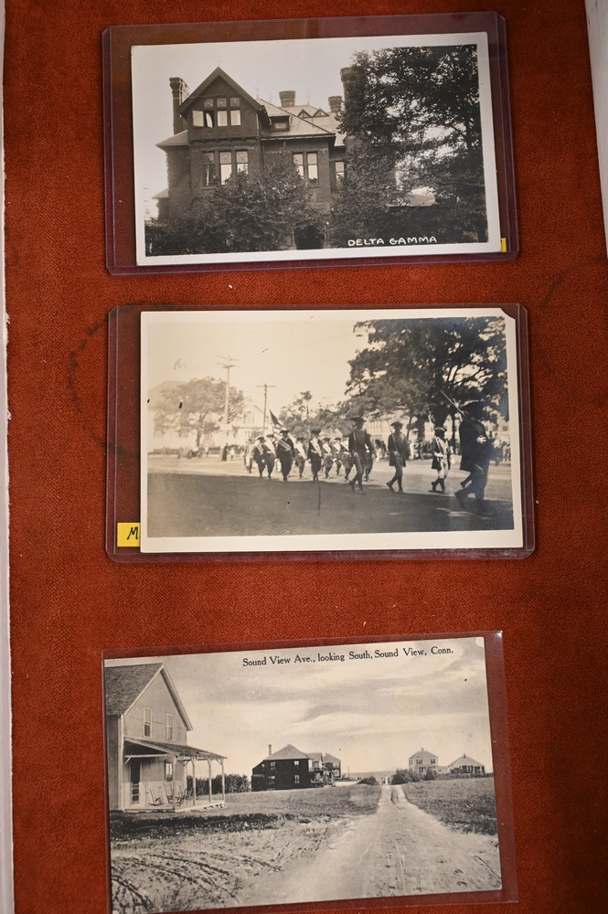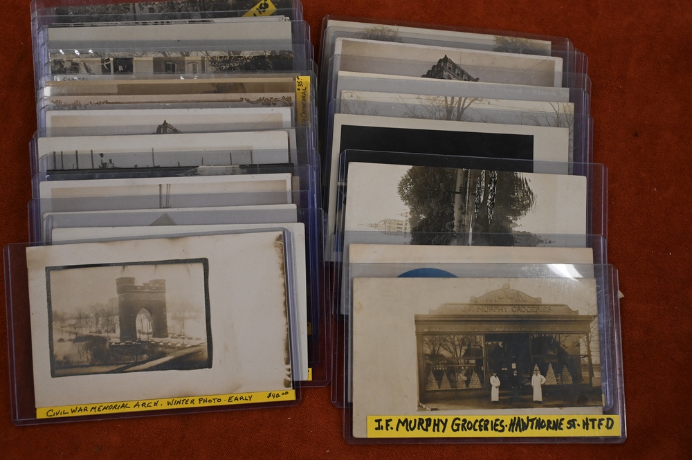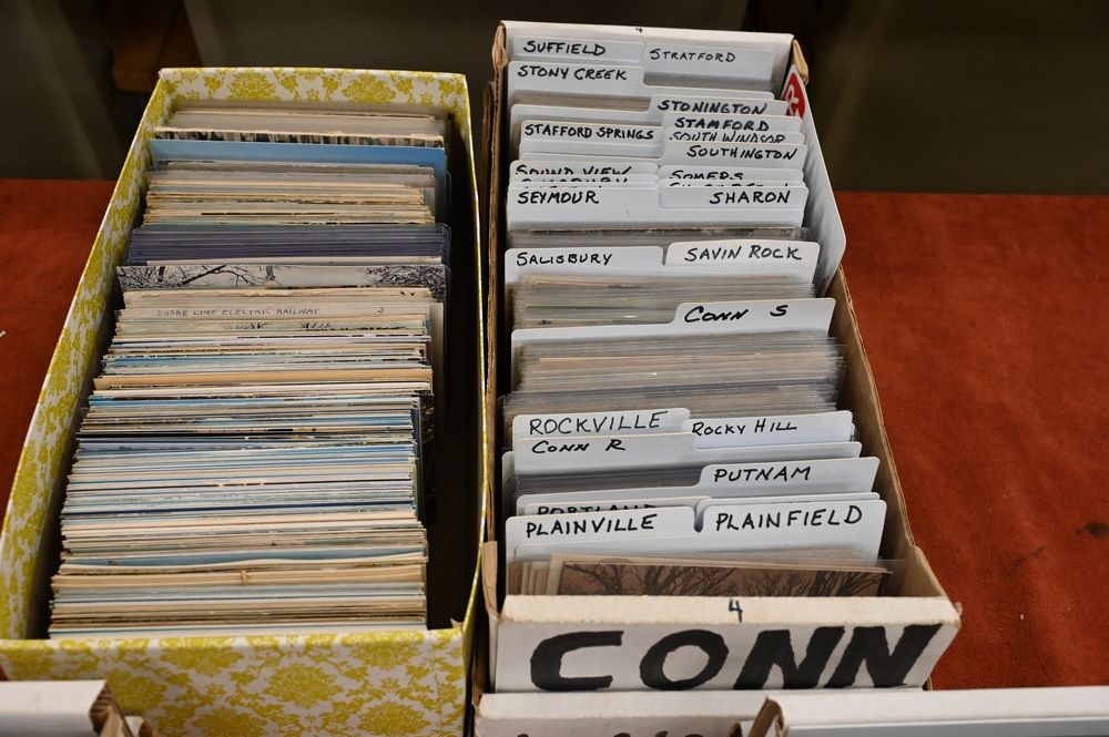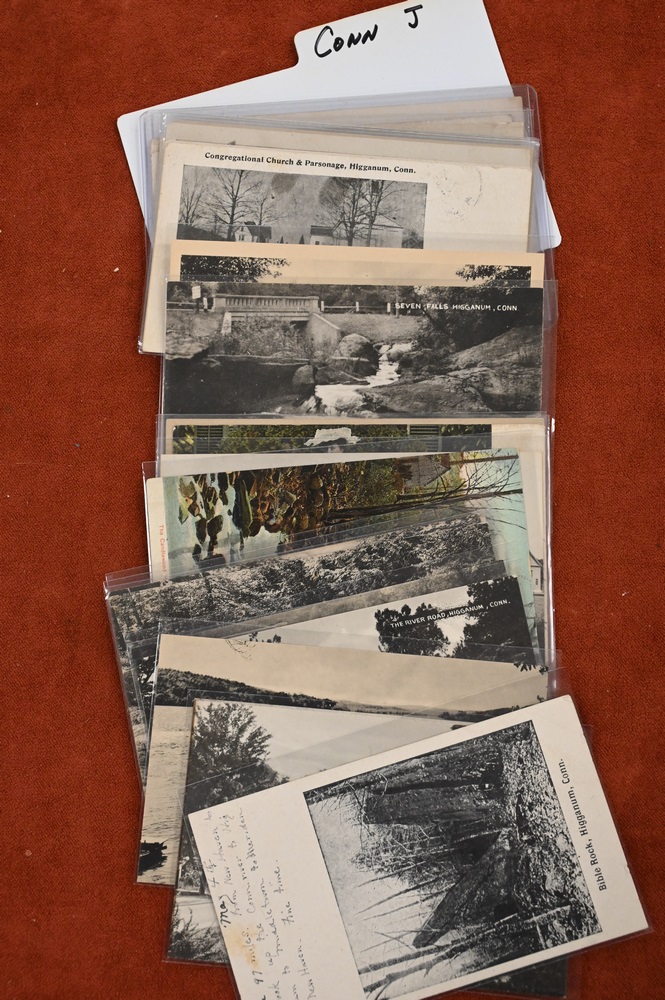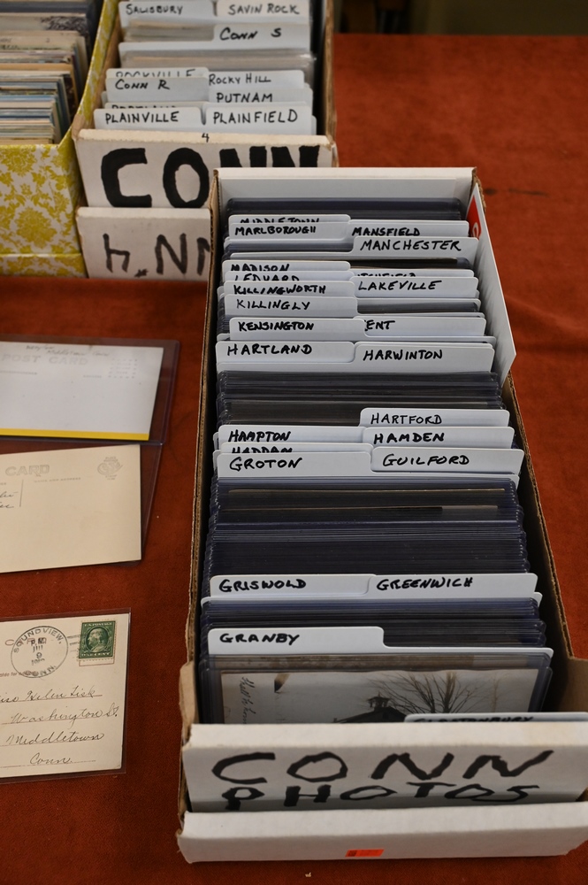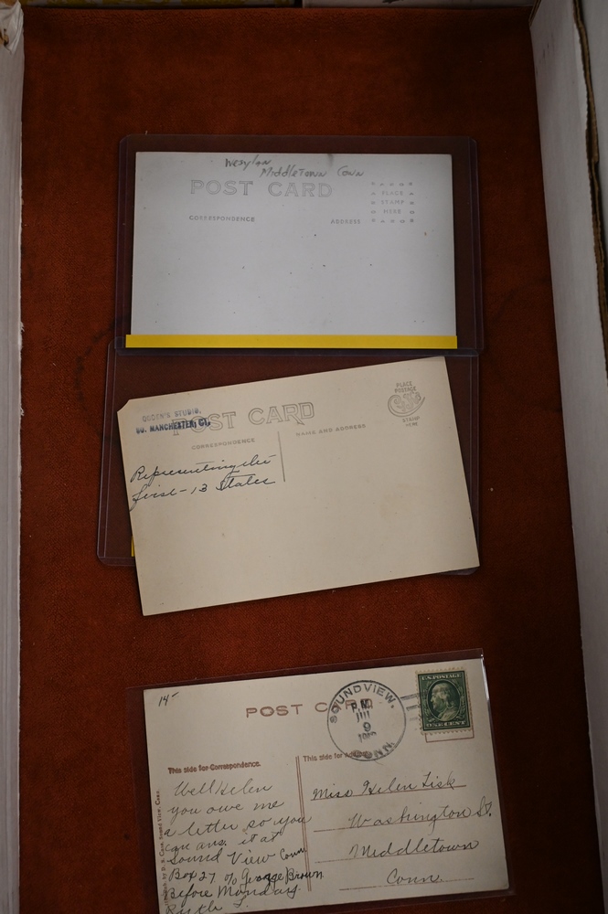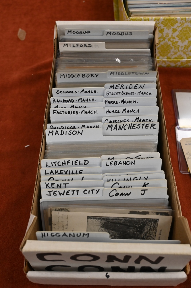 Lot 120: Large Lot of Connecticut Postcards, in boxes, labeled by town, including many topics such as parades, buildings, ocean scenes, etc., to include a box of Real Picture Postcards (RPPC).