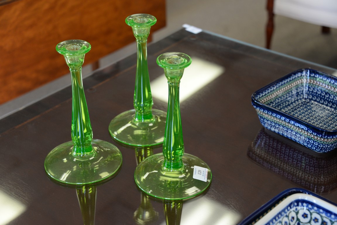 Lot 120: Nine piece crystal group to include a set of four clear crystal candlesticks ht. 9 1/4in., set of four green glass candlesticks ht…