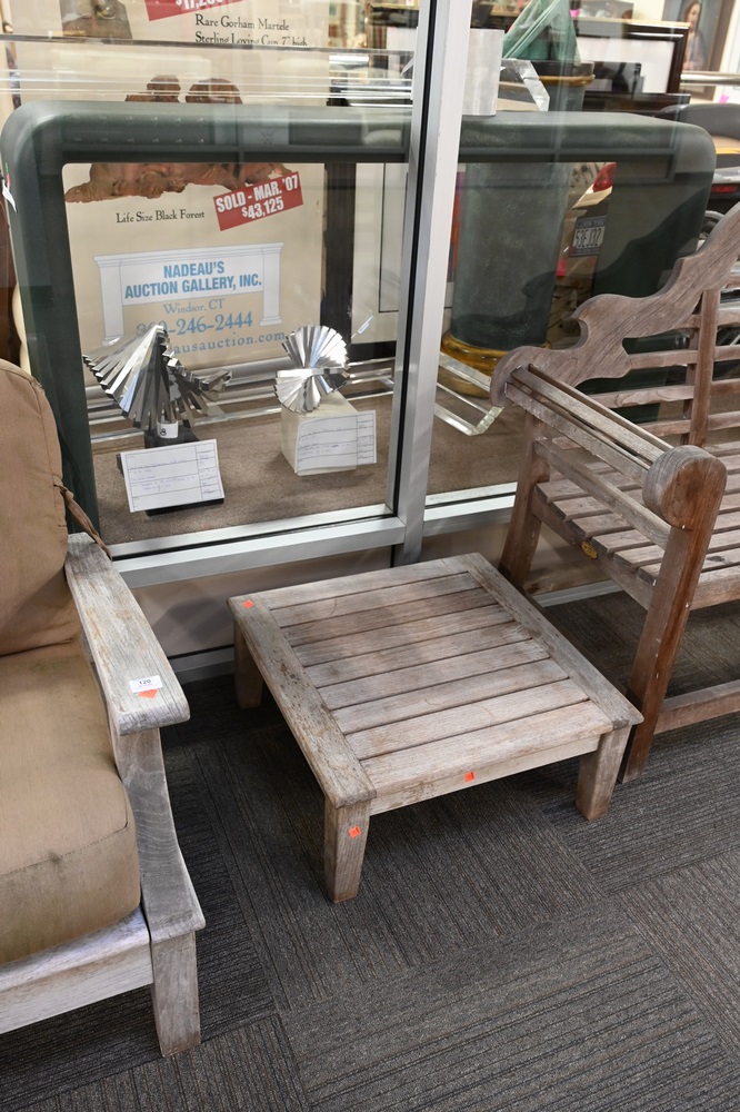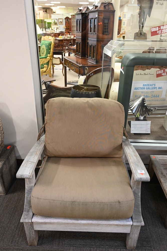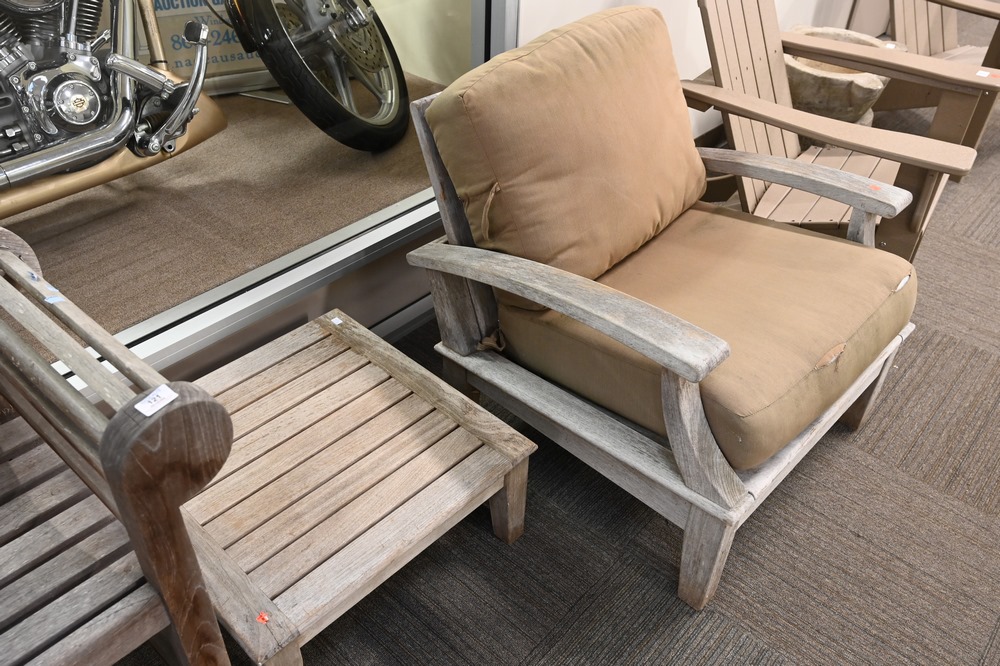 Lot 120: Pair of Gloster Teak Outdoor Armchairs, along with footstools, height 29 inches, width 30 inches.