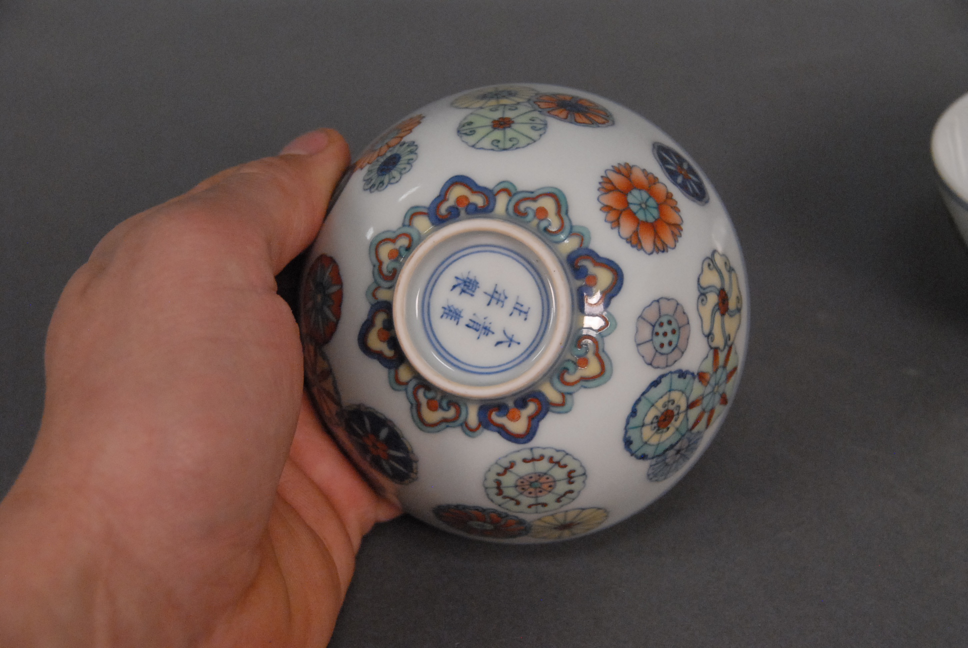 Pair of porcelain cups with Yongzheng mark on the bottom, ht. 2in. dia. 4in.