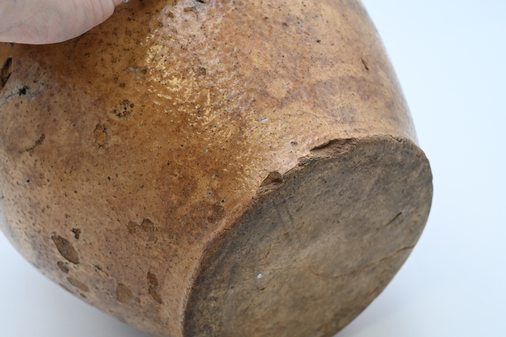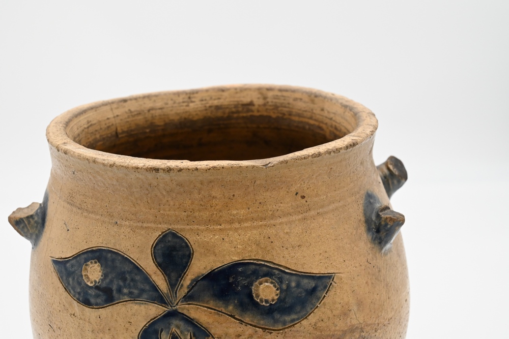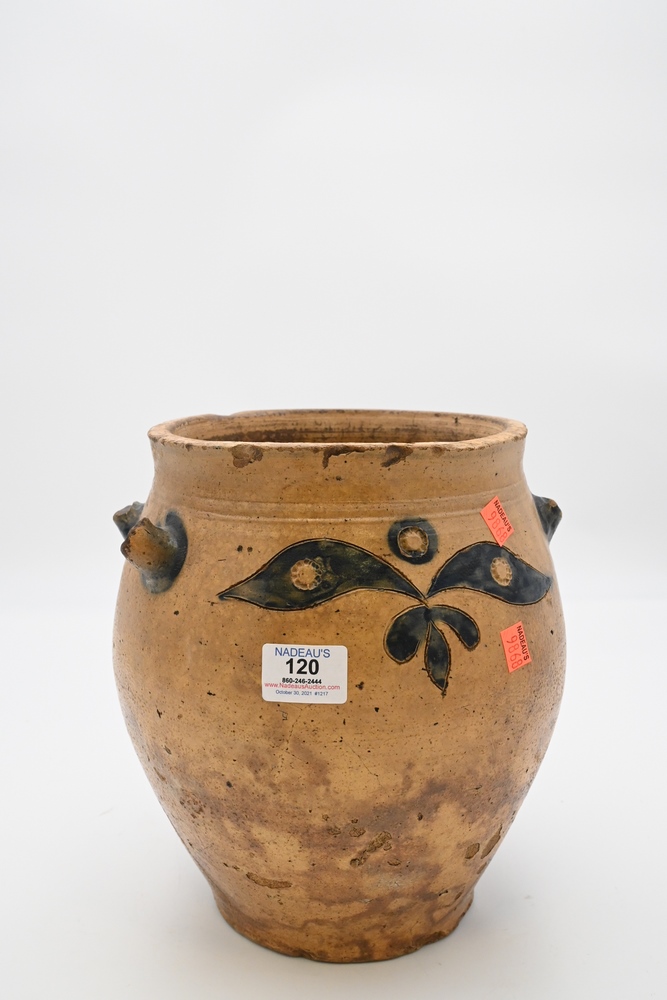 Lot 120: Stoneware Crock having incised foliate decoration with impressed flowers possibly by Corlears Hook, New York (both handles missing, cracks and glaze chips) height 11 inches Provenance: Estate of Bruce Sasalla, East Hartford, Connecticut.