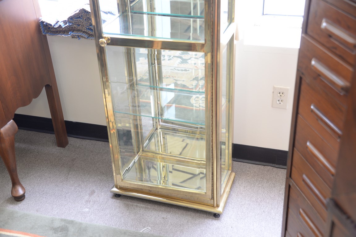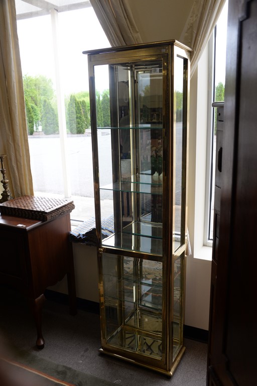 Tall brass and glass cabinet, lighted with four glass shelves. ht. 76in., wd. 20in., dp. 11in.
