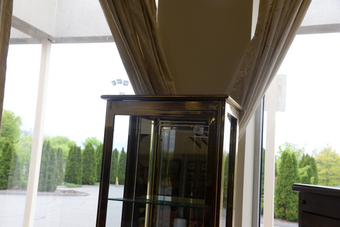 Lot 120: Tall brass and glass cabinet, lighted with four glass shelves. ht. 76in., wd. 20in., dp. 11in.