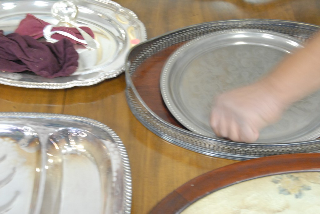 Three trays silverplated tray, wooden tray, and wood and silverplate tray.