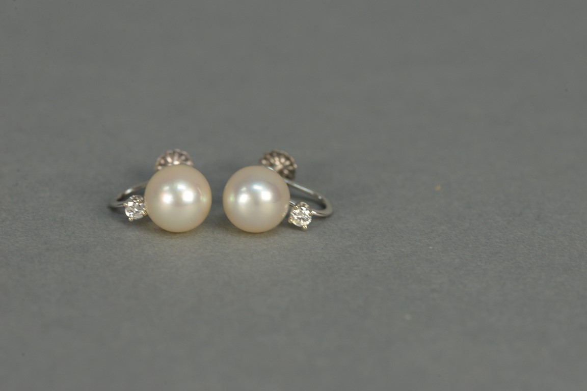 Tiffany & Co. pair of earrings set with pearl and small diamond having screw backs.