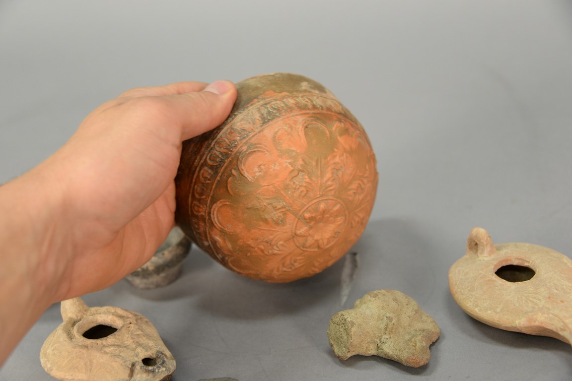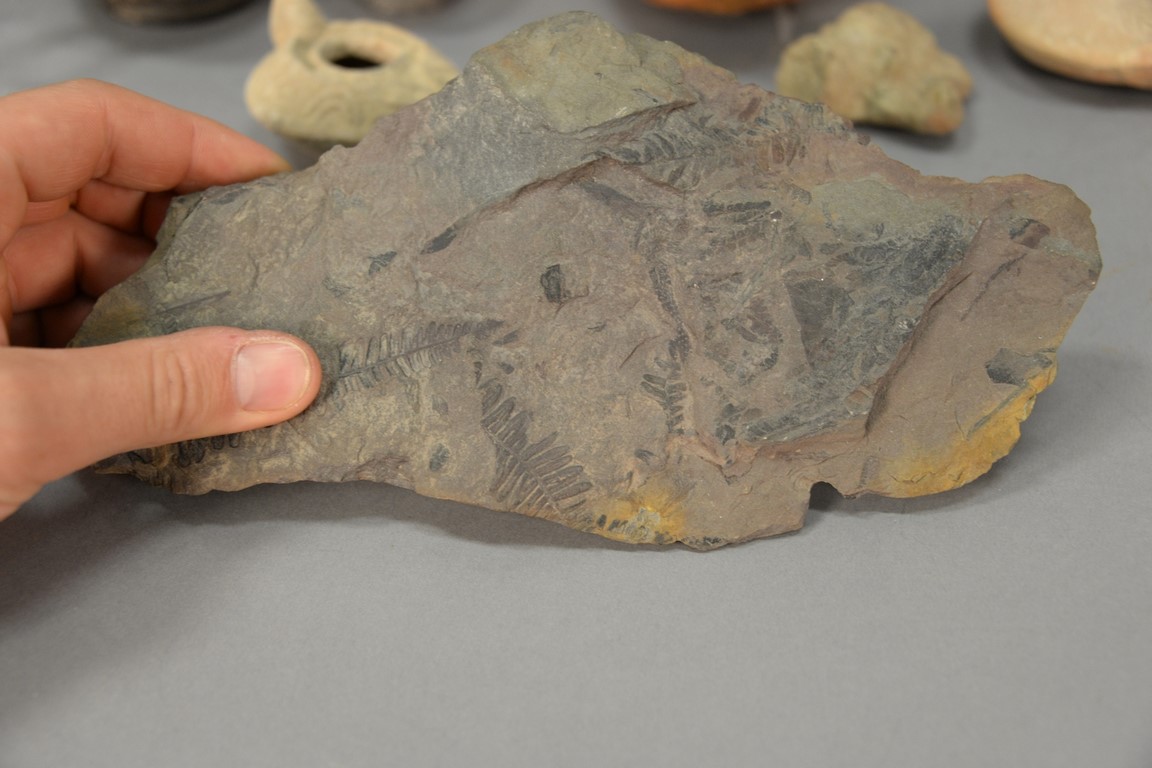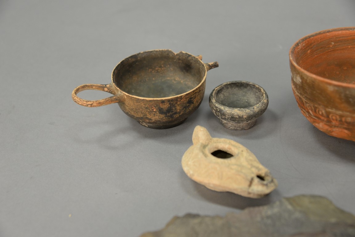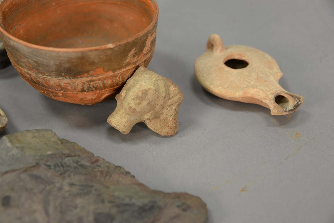 Lot 120: Tray lot to include two Roman clay oil lamps, handled clay cup as is, two small clay bowls, and fern fossil lg. 9 1/2in.